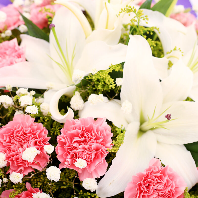 花 材:33支粉色康乃馨+2支多头白百合,搭配黄莺、满天星。