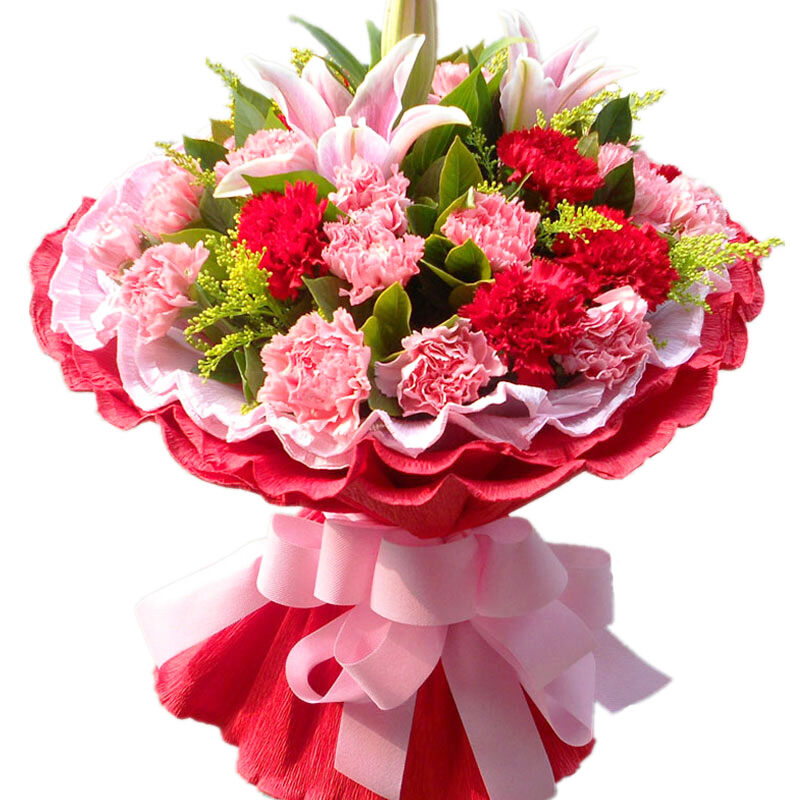 花材: 19支混色康乃馨(红康乃馨+粉色康乃馨,1支多头粉百合,搭配黄英草装饰。