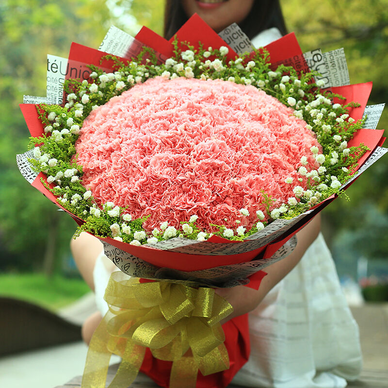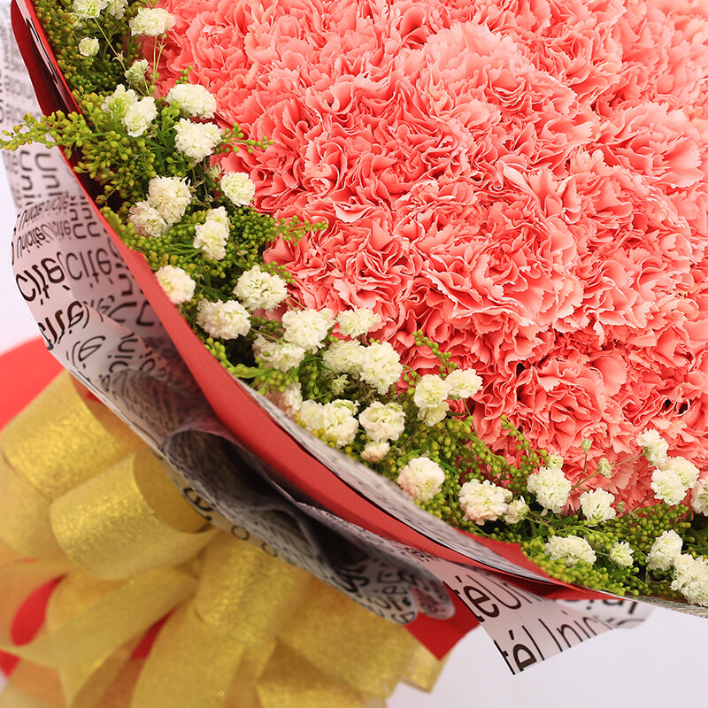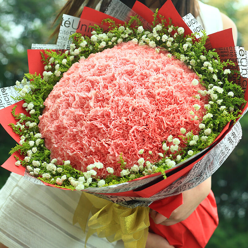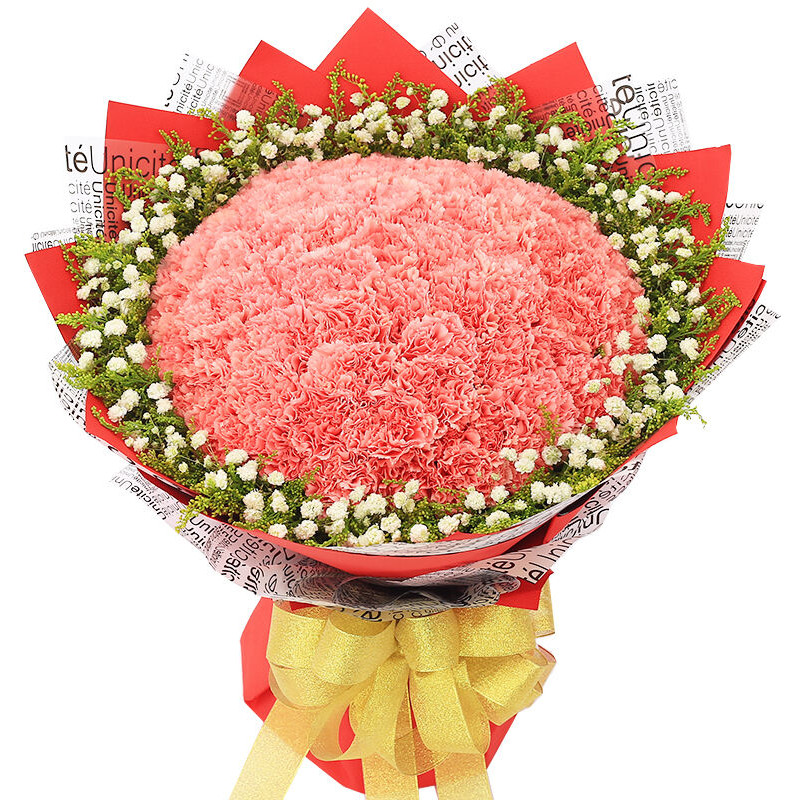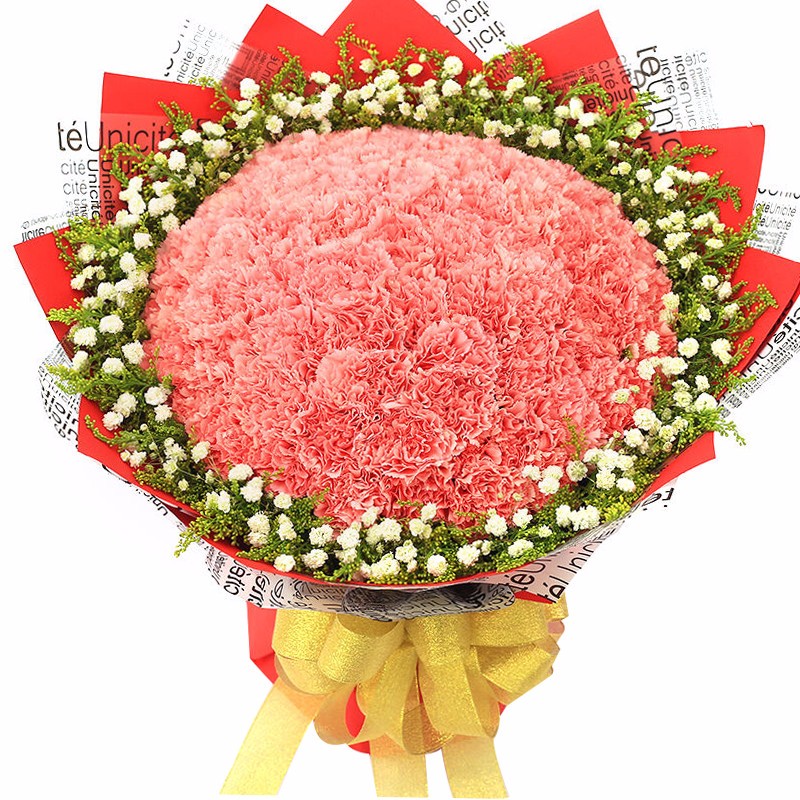 花 材:99支粉色康乃馨,搭配黄莺、满天星。