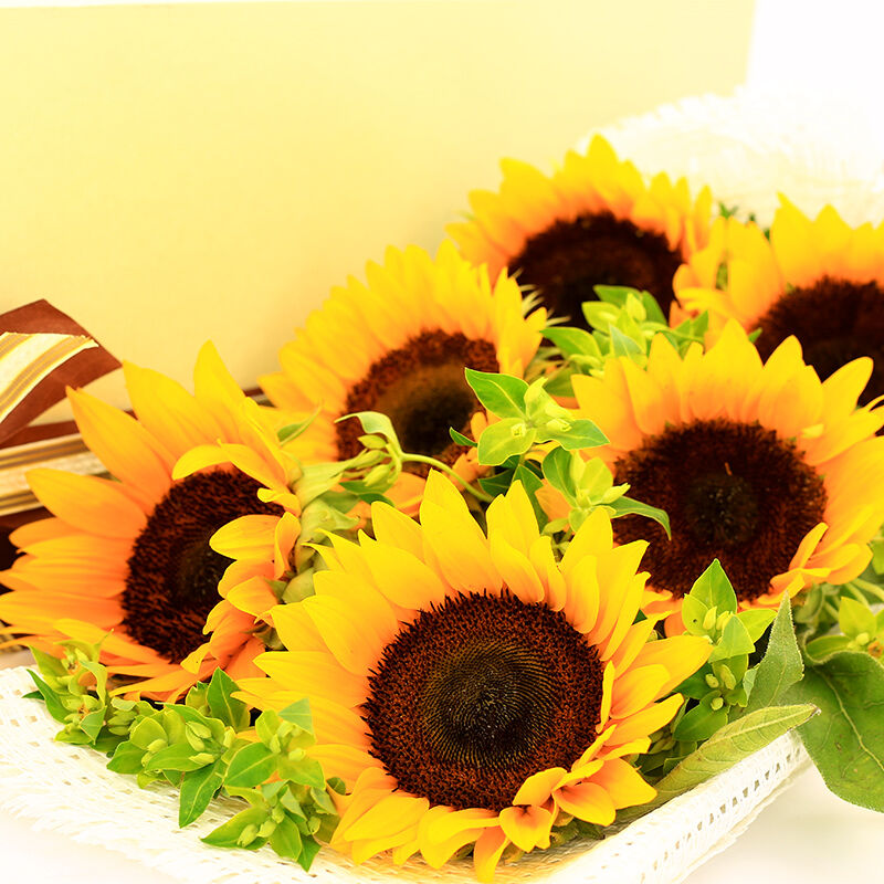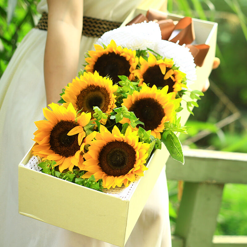 花 材:6支精品向日葵,搭配黄莺或绿叶。