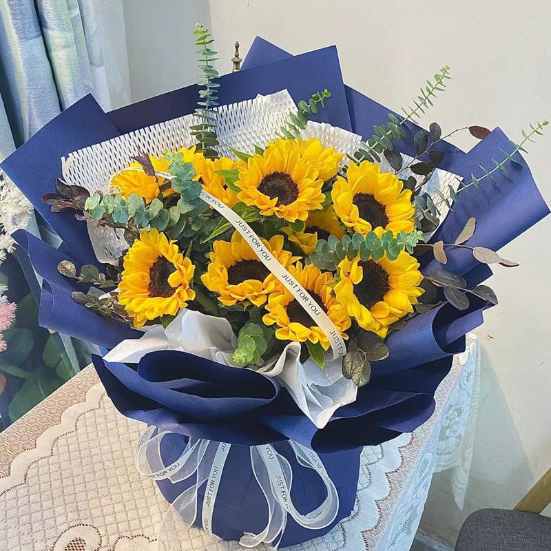 花 材:9朵向日葵,搭配尤加利叶装饰。