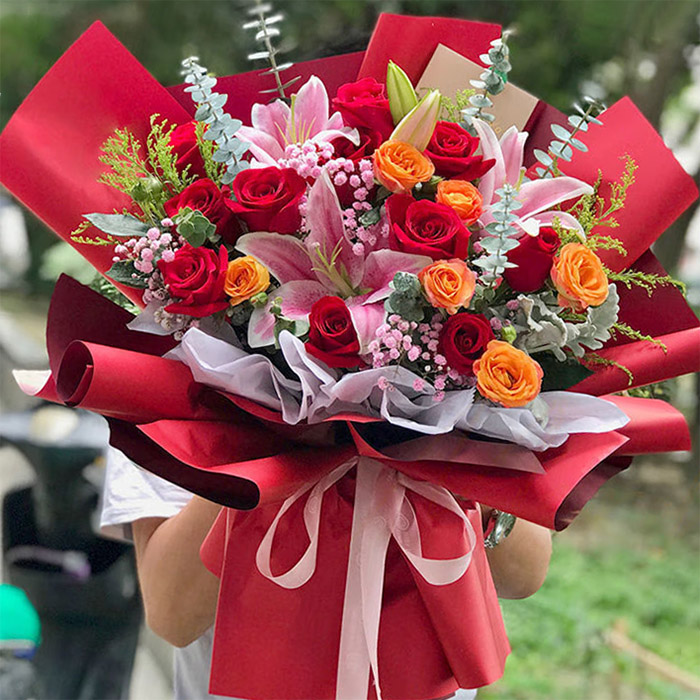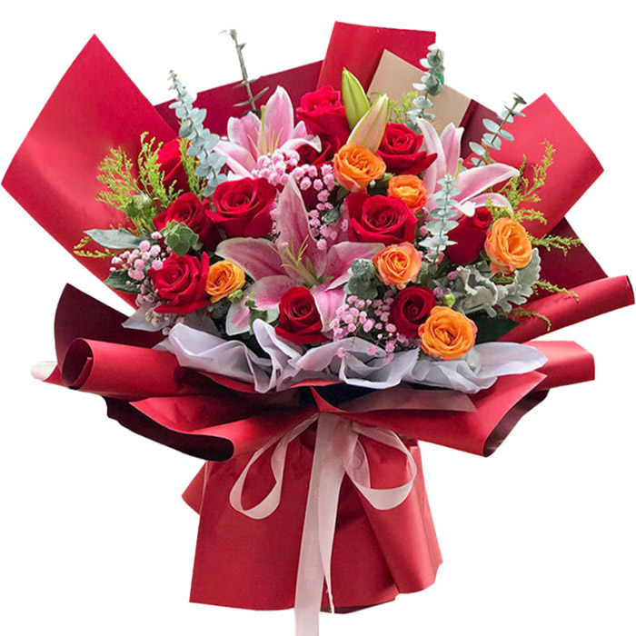 花 材:11支红玫瑰,2支多头粉色香水百合,3支橙色泡泡,搭配粉色满天星、尤加利叶装饰。