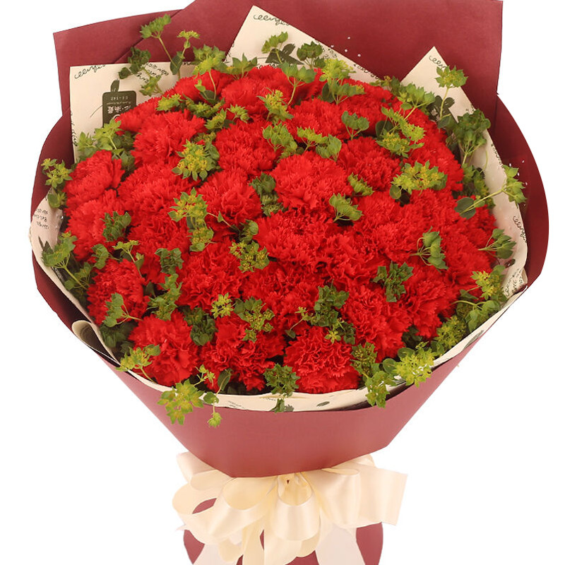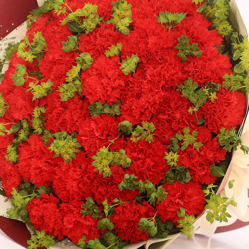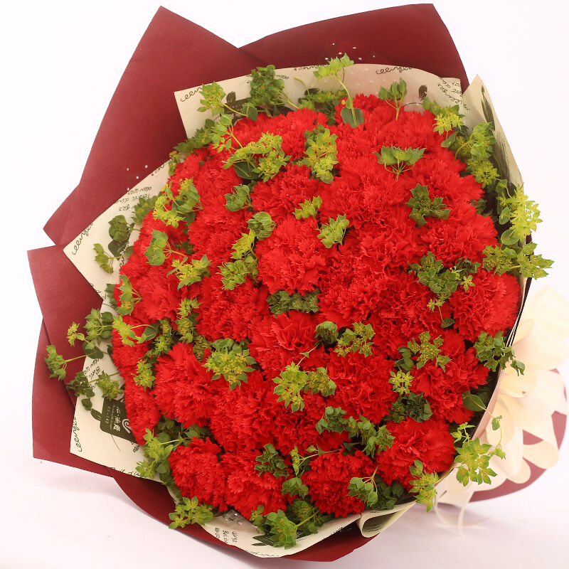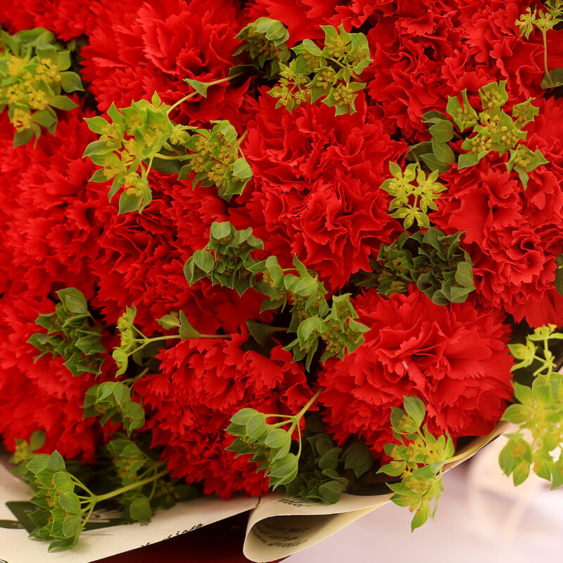 花 材:精选33支红色康乃馨,搭配叶上黄金点缀。
