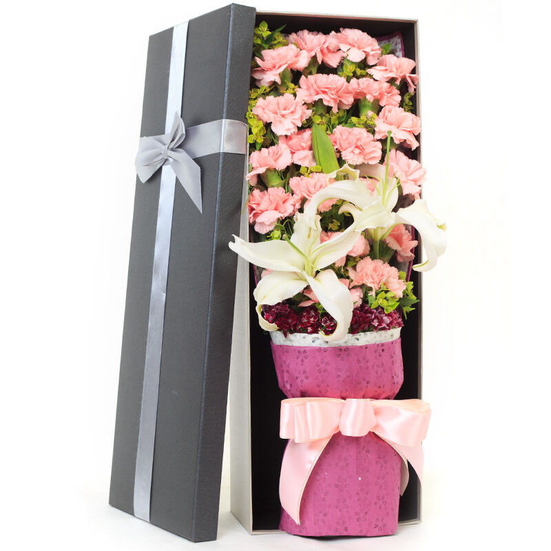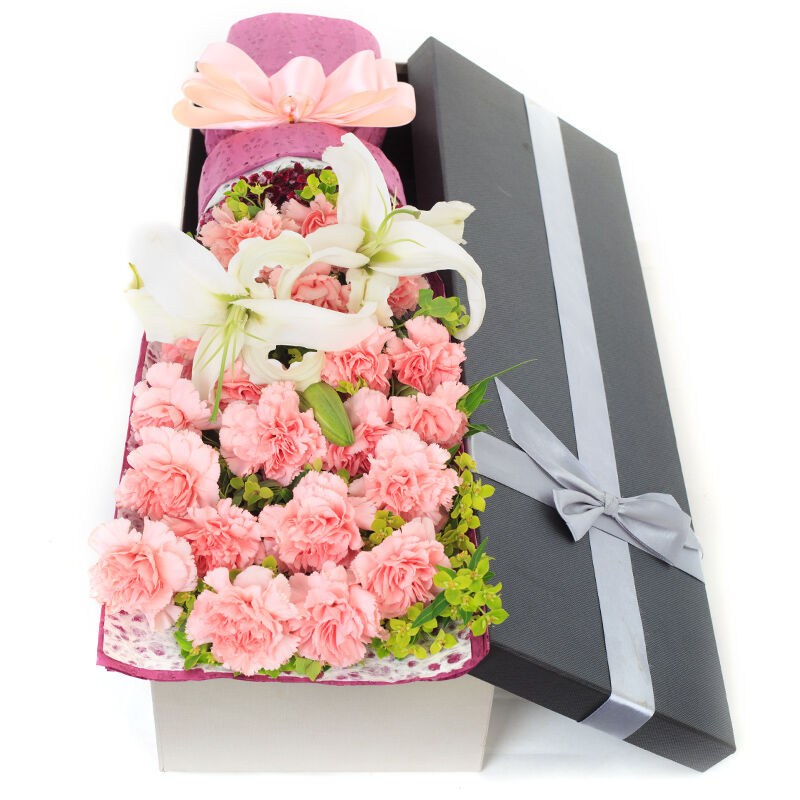 花材: 19支粉色康乃馨+1支多头白百合,搭配适量叶上黄金、石竹梅。