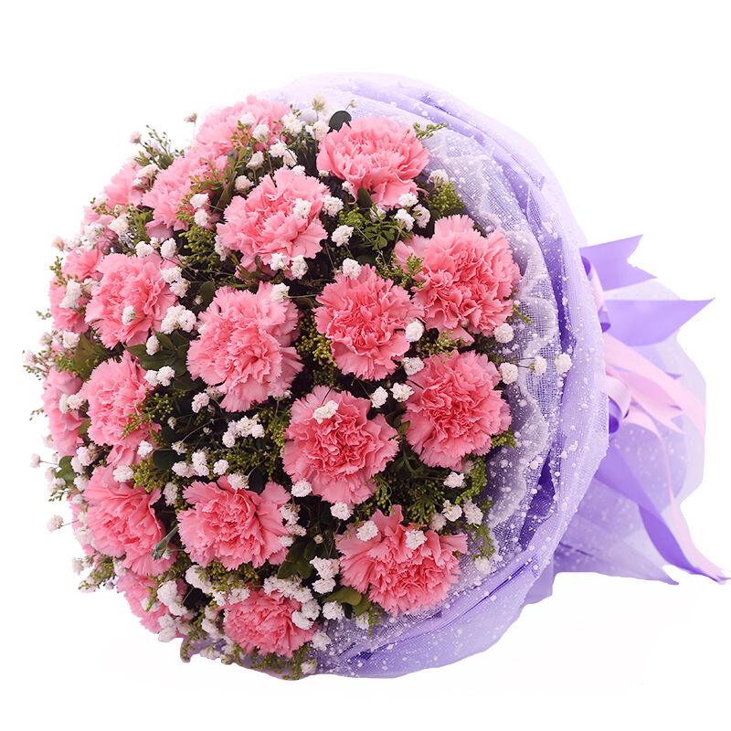 花材: 19支粉色康乃馨,搭配黄莺、满天星。
