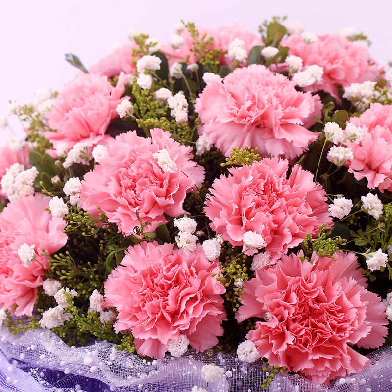 花 材:19支粉色康乃馨,搭配黄莺、满天星。