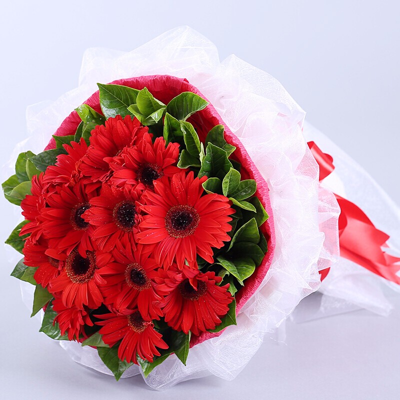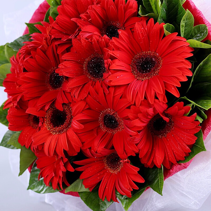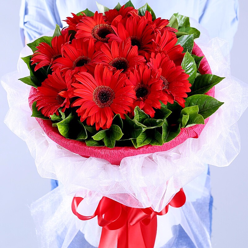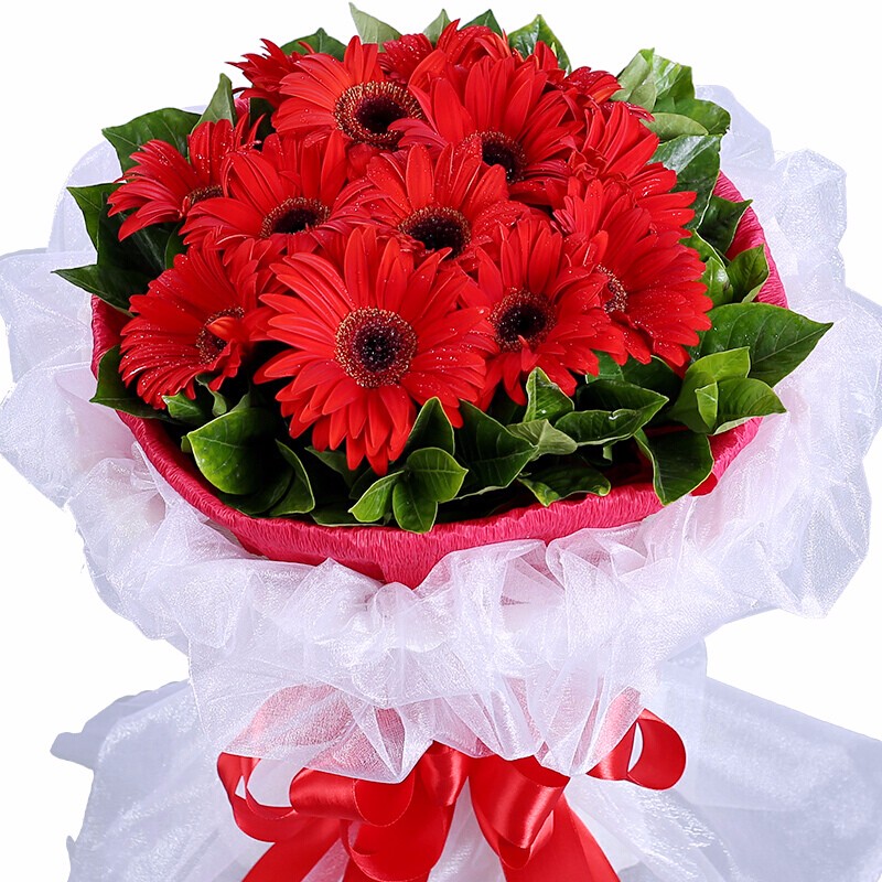 花材: 11朵红色扶郎花,绿叶点缀。