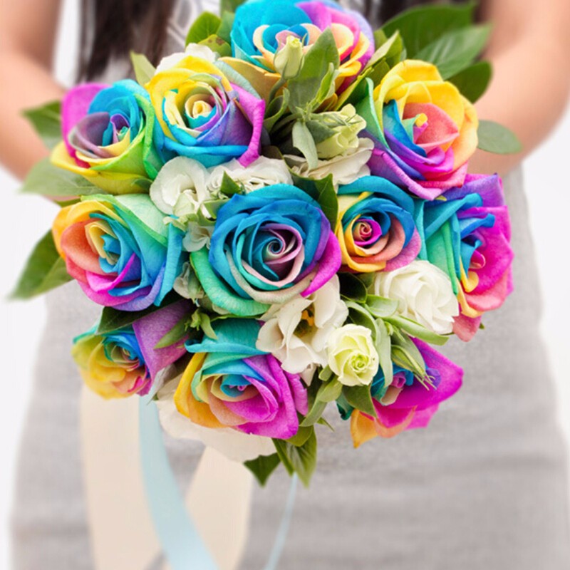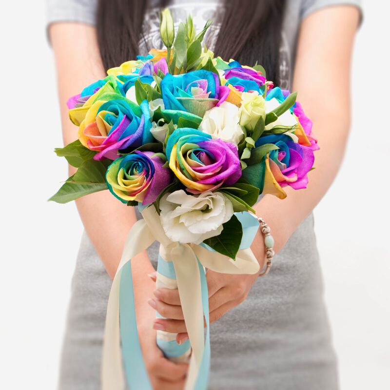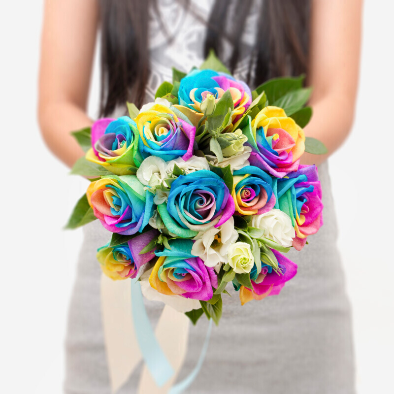 包 装:11支精品七彩玫瑰,搭配适量白色桔梗、栀子叶。