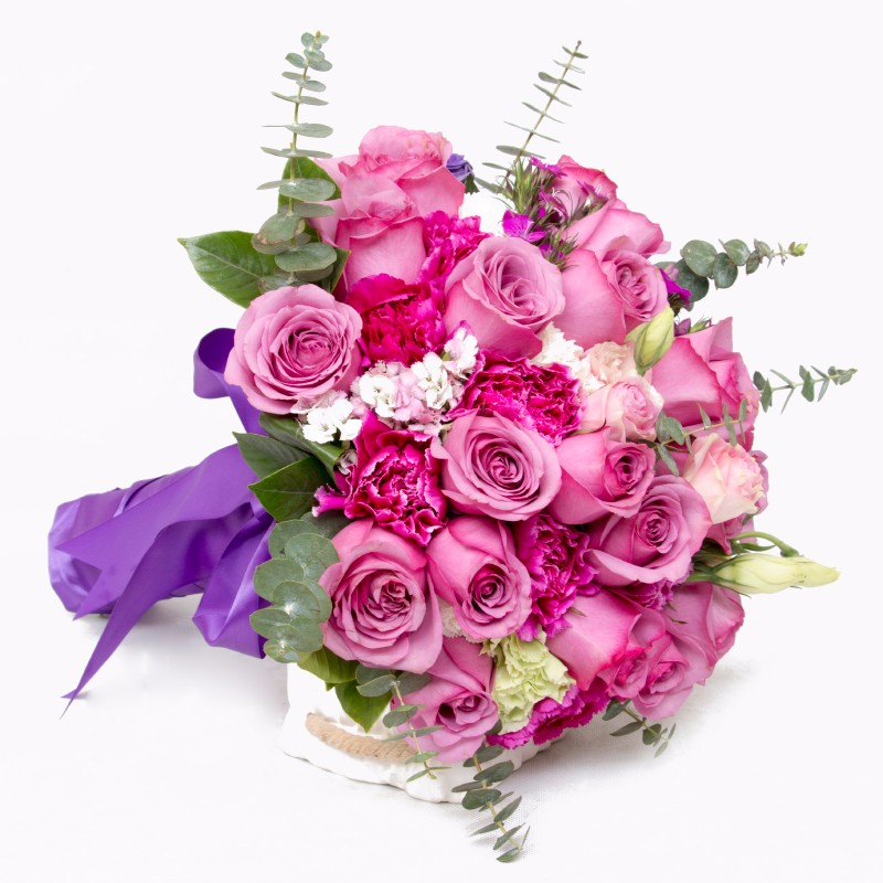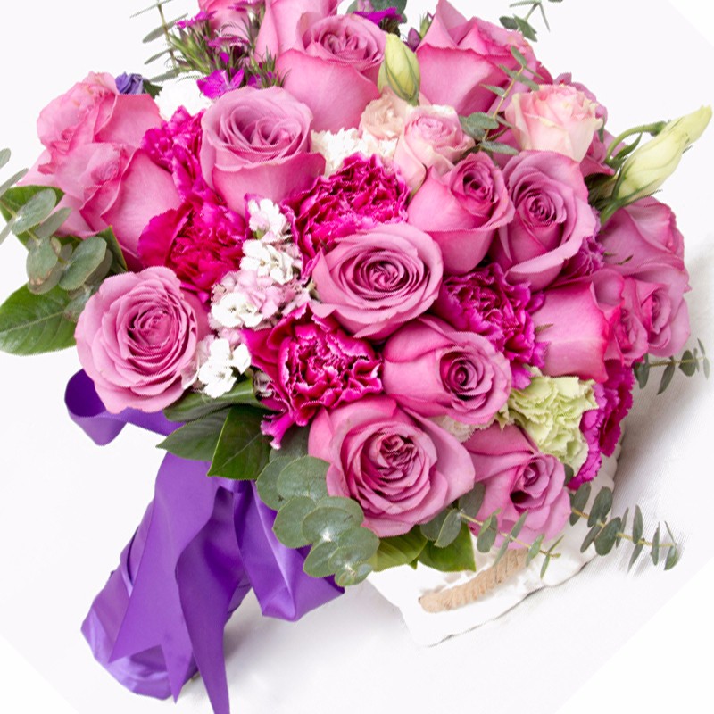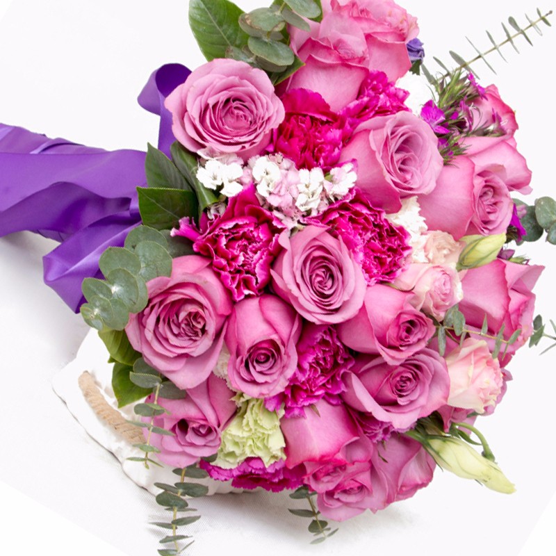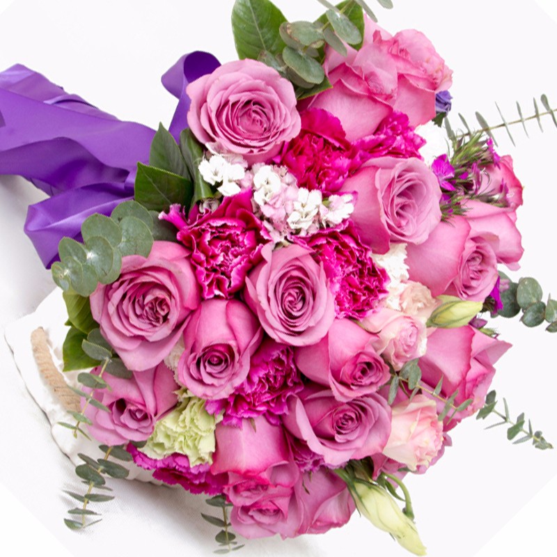 包 装:19支精品玫红色玫瑰花+9支玫红色康乃馨,搭配适量粉色桔梗、浅绿色桔梗、粉色石竹梅、尤加利、栀子叶。
