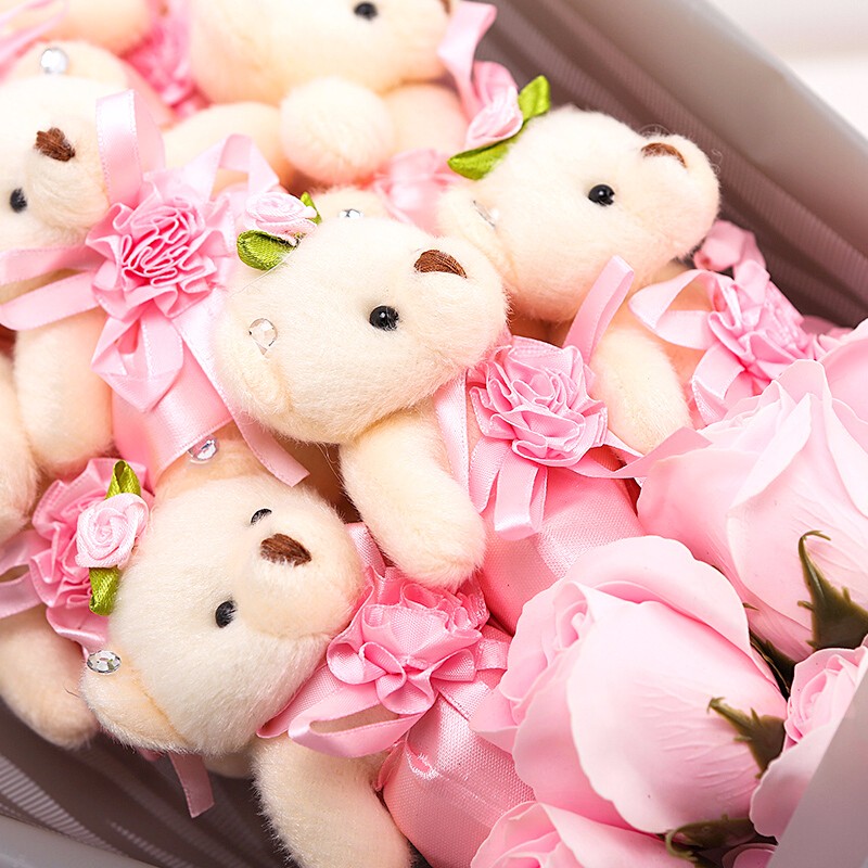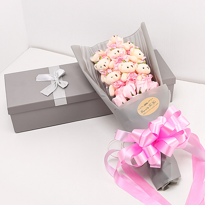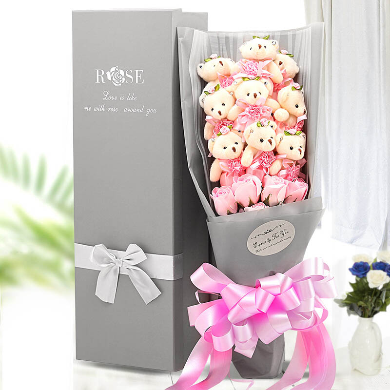 花材: 9只可爱粉色小熊,5支粉玫瑰。