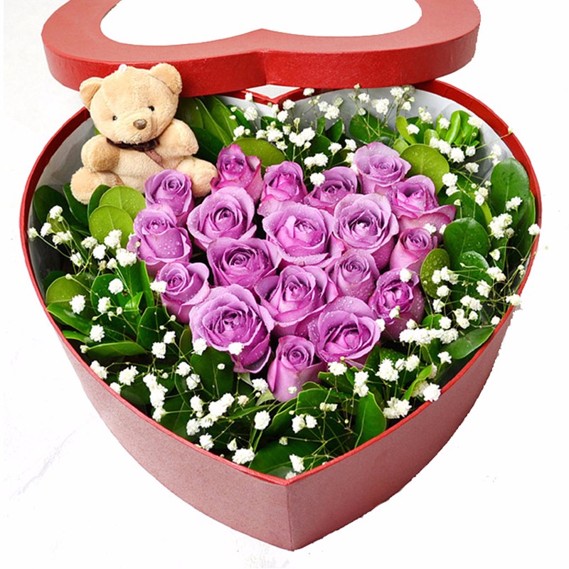 花 材:19支精品紫玫瑰、1只可爱小熊,搭配适量白色满天星、栀子叶(珍贵稀少花材,请提前预定或咨询客服)