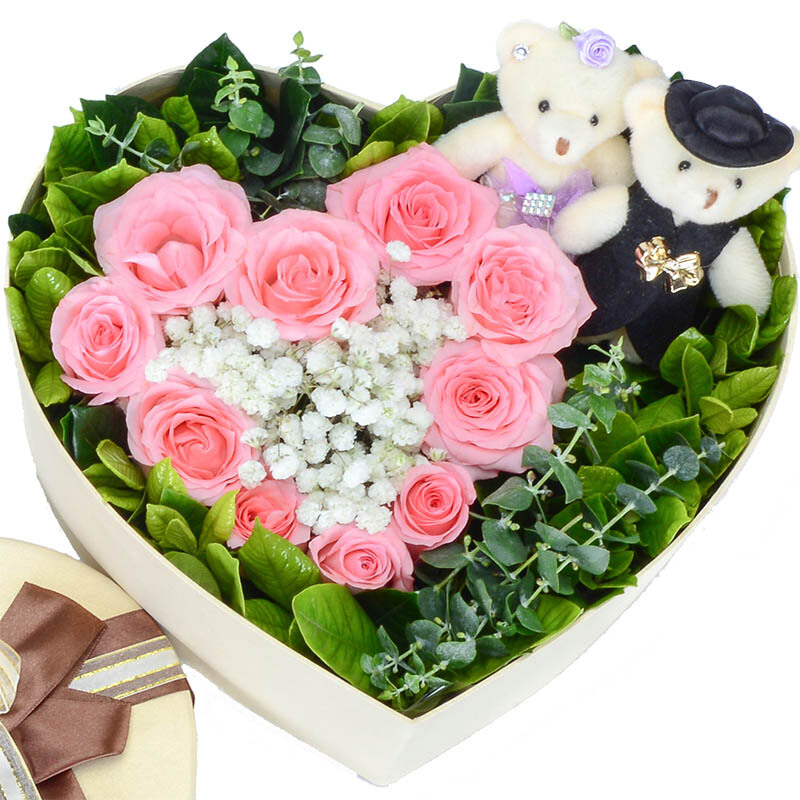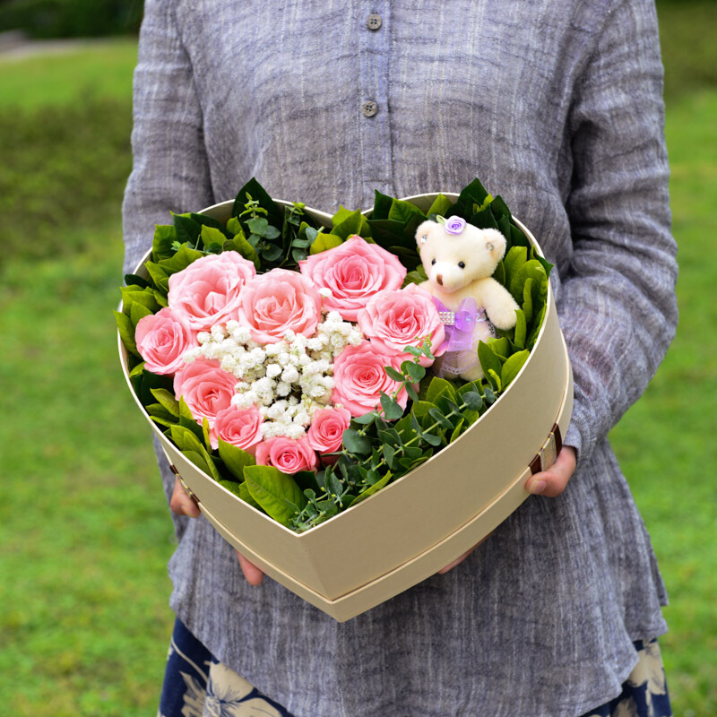 花材: 10支精品粉玫瑰+2只可爱小熊,搭配适量白色满天星、尤加利、栀子叶。