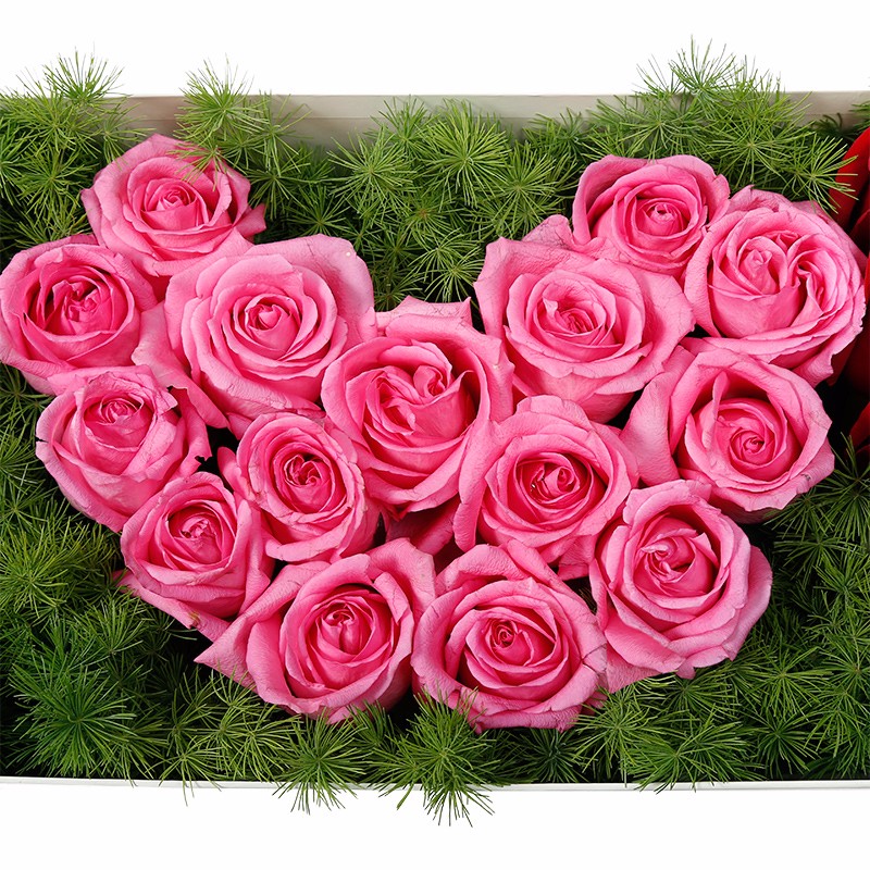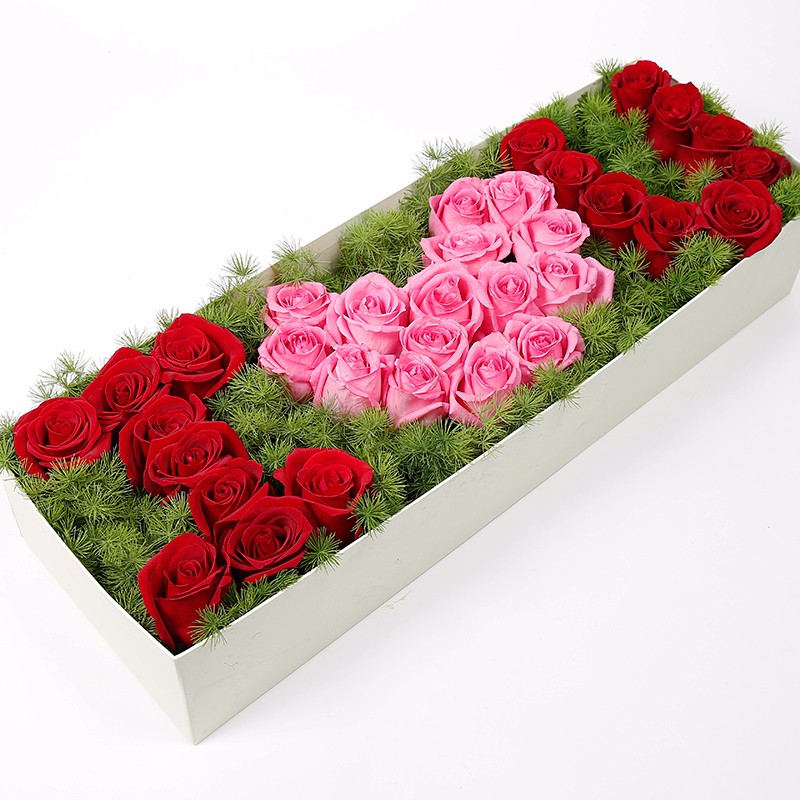 花材: 33支精品混色玫瑰(红玫瑰、粉玫瑰),搭配适量天冬门。
