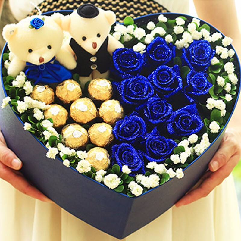 花材: 11朵蓝色妖姬、9颗费列罗巧克力、一对可爱小熊。