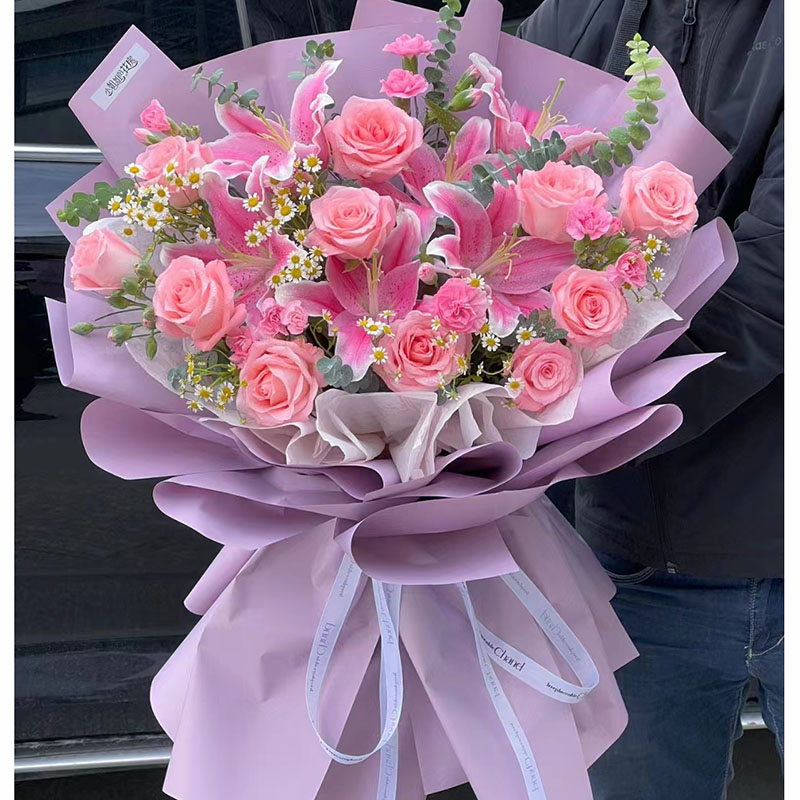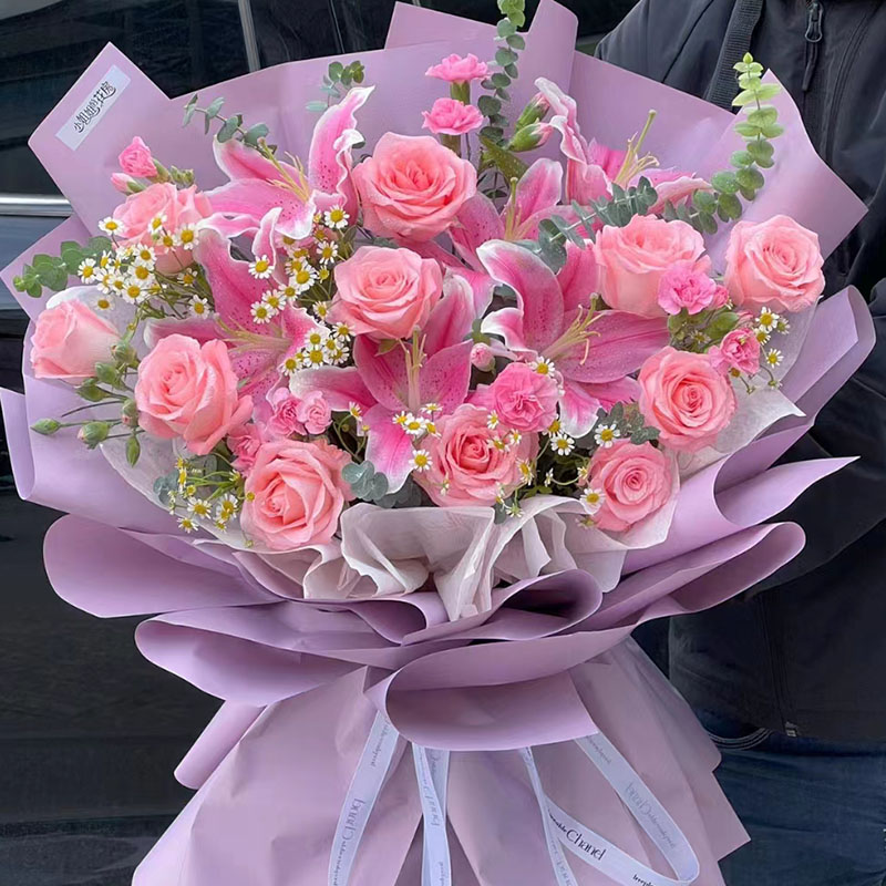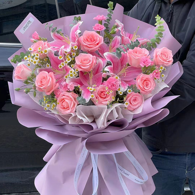 花材: 11朵粉玫瑰,3支多头粉色香水百合,搭配多头粉康,尤加利叶、洋甘菊、洋桔梗装饰。