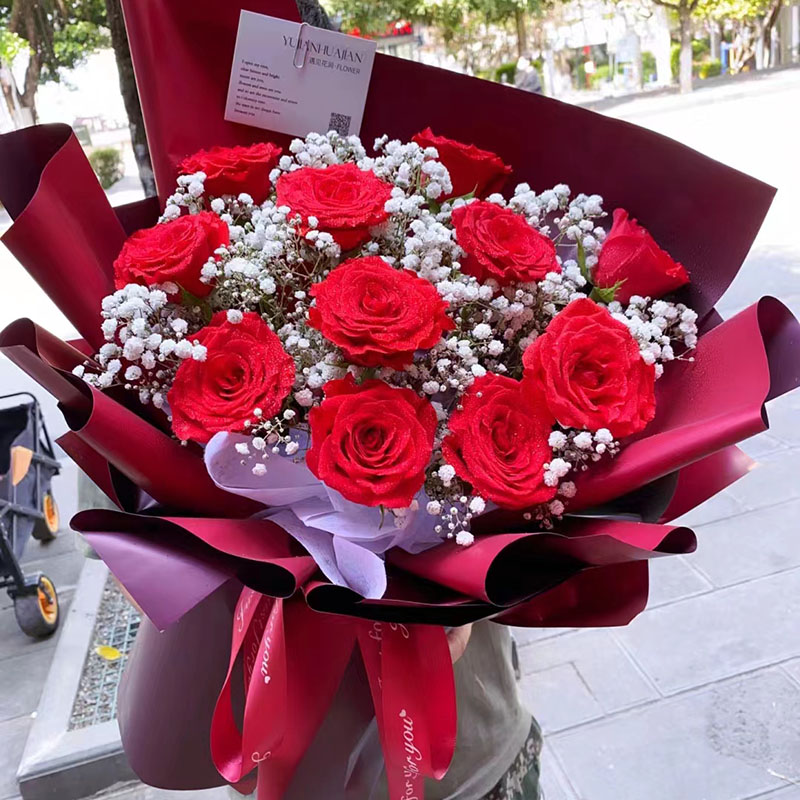 花材: 11朵红玫瑰,搭配满天星装饰。