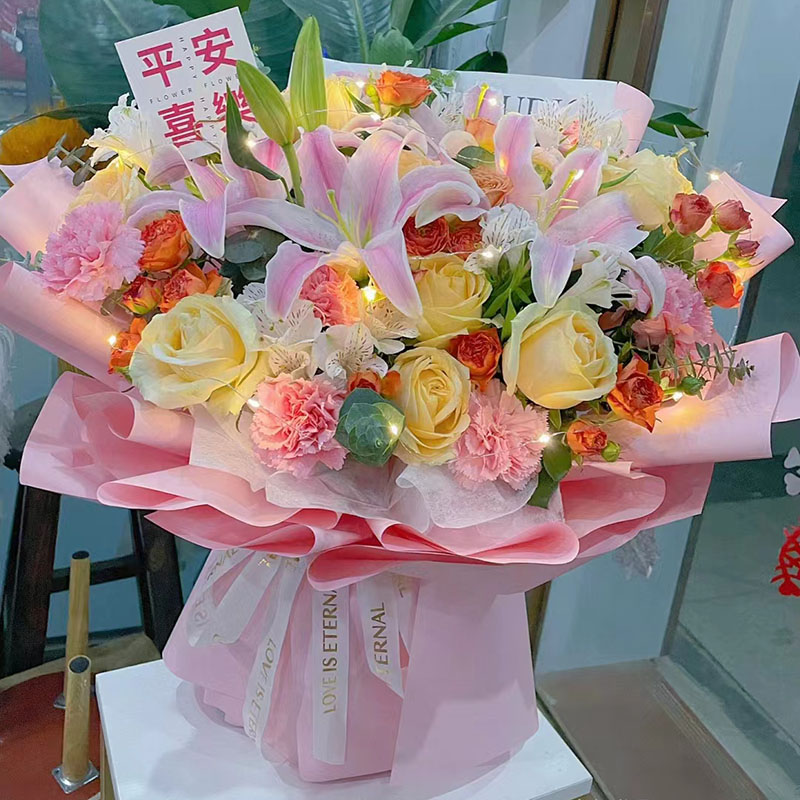 花 材:香槟玫瑰和粉色康乃馨混搭共19朵,4支多头粉色香水百合,1条灯带,搭配8支橙色多头小玫瑰,洋桔梗,尤加利叶装饰。