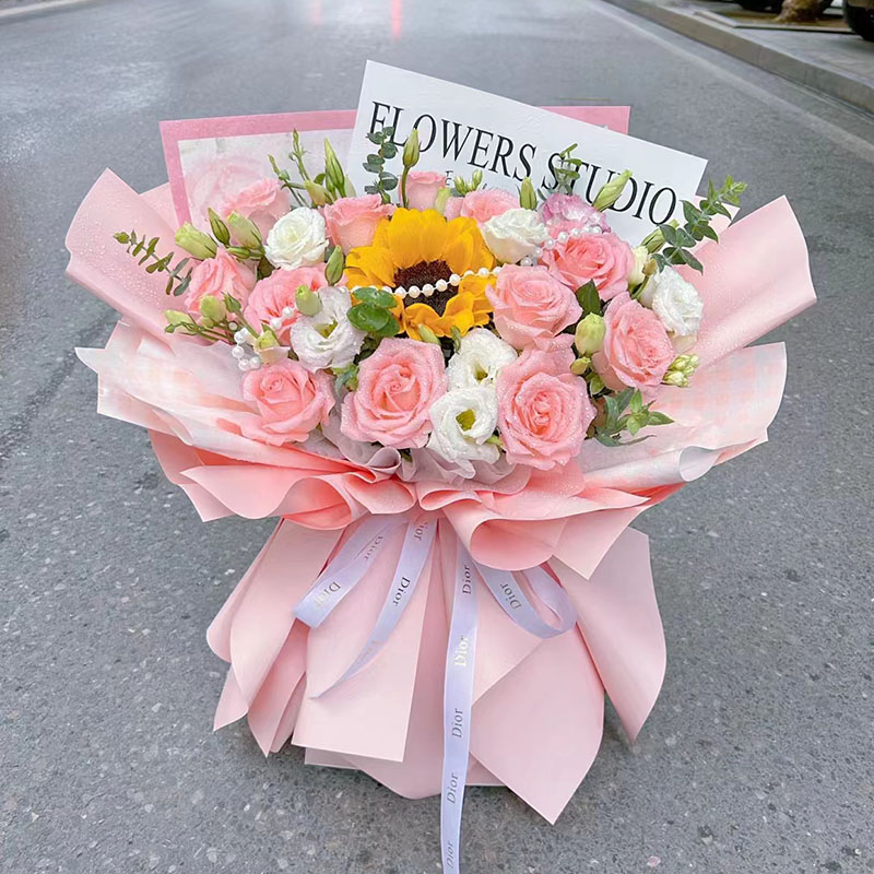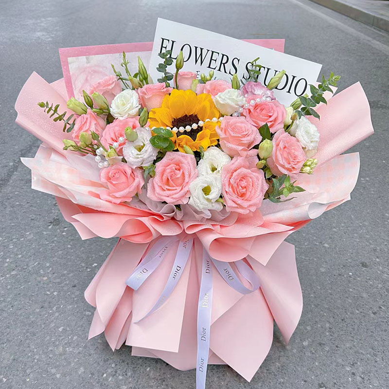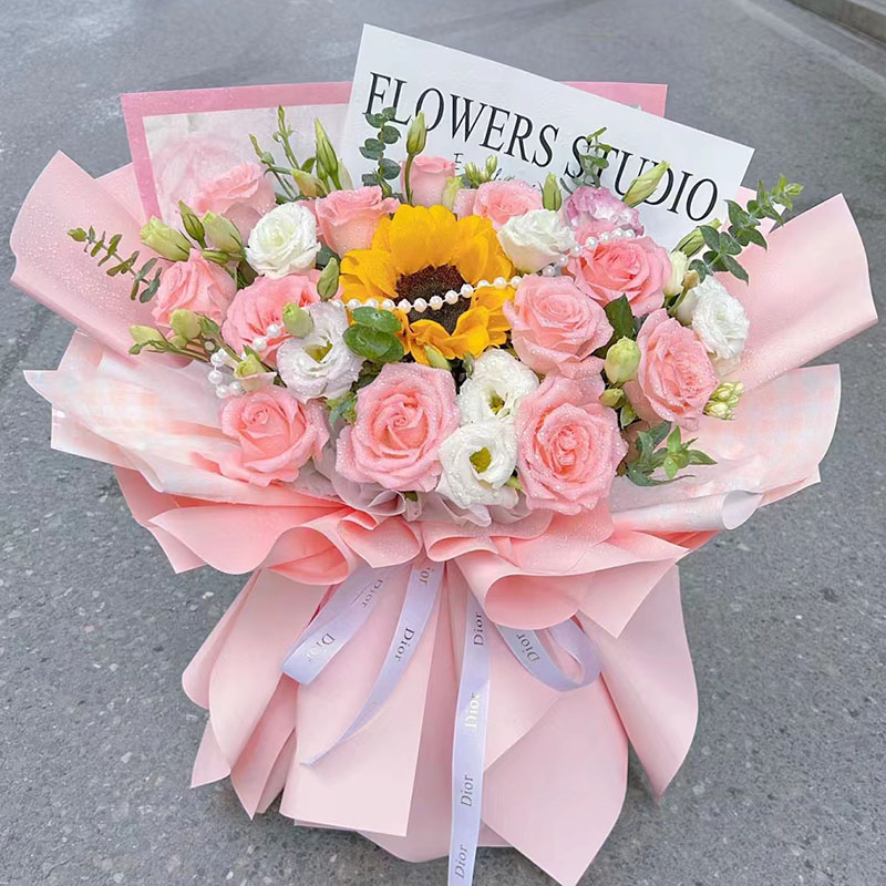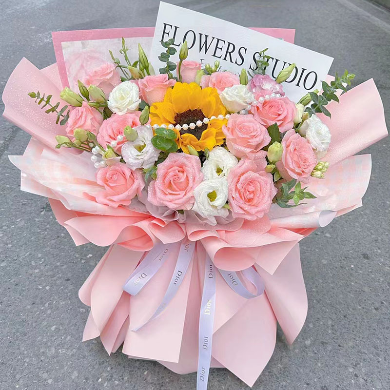 花 材:12朵粉玫瑰,1朵向日葵,1条珠串,6支白色洋桔梗(断货则用6支白玫瑰代替),搭配尤加利叶装饰。