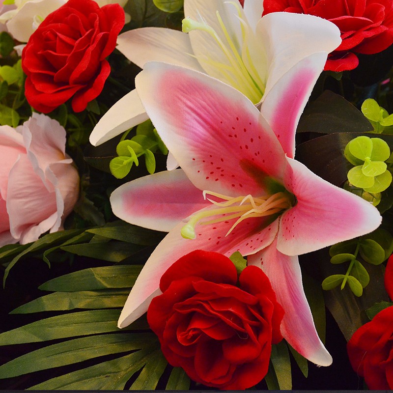 包 装:15支红玫瑰、5支粉玫瑰、5支香槟玫瑰、2支多头粉百合、2支多头白百合,搭配适量散尾葵、叶上黄金、栀子叶。
