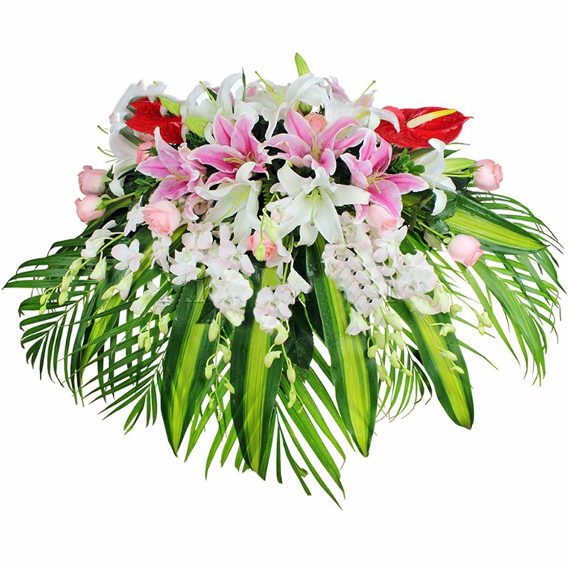 包 装:2支多头粉百合、3支多头白百合、2支红掌、11支精品粉玫瑰,搭配适量白色洋兰、巴西叶、散尾葵。