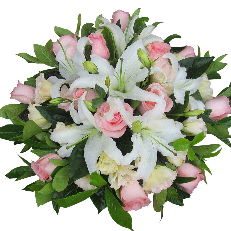 包 装:3支多头白百合、13支粉玫瑰、5支浅黄色洋桔梗,搭配适量栀子叶。