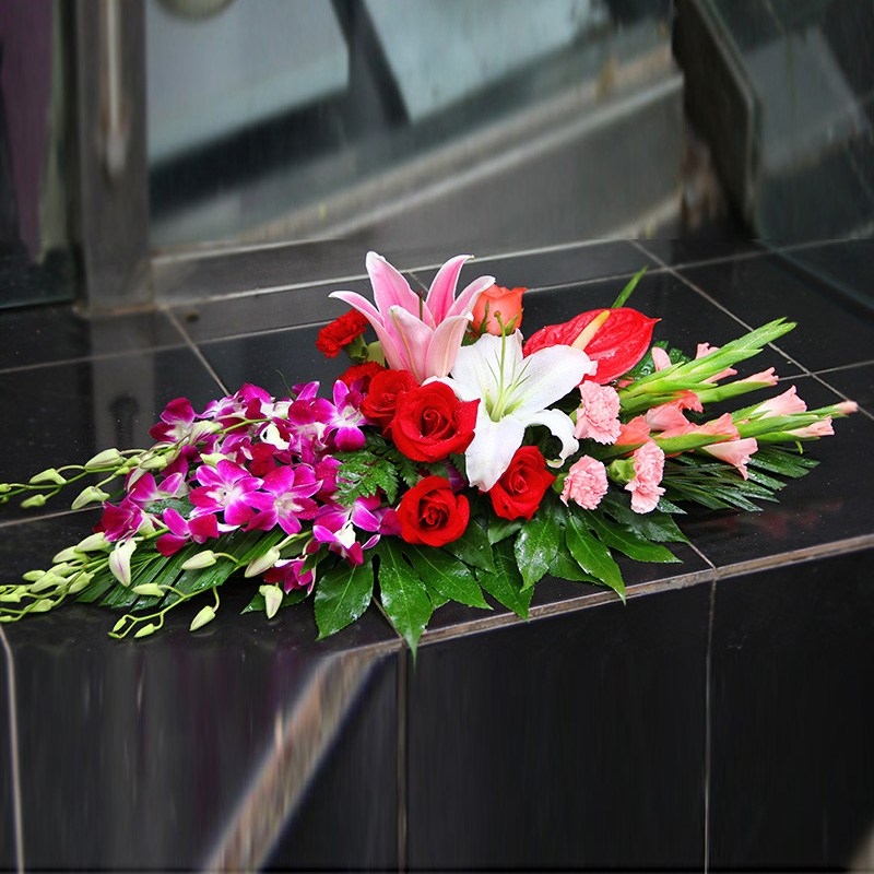 包装: 4支红玫瑰、2支粉玫瑰、3支红色康乃馨、3支粉色康乃馨、1支白百合、1支粉百合、1支红掌,搭配适量洋兰、粉色剑兰、散尾葵、龟背叶。