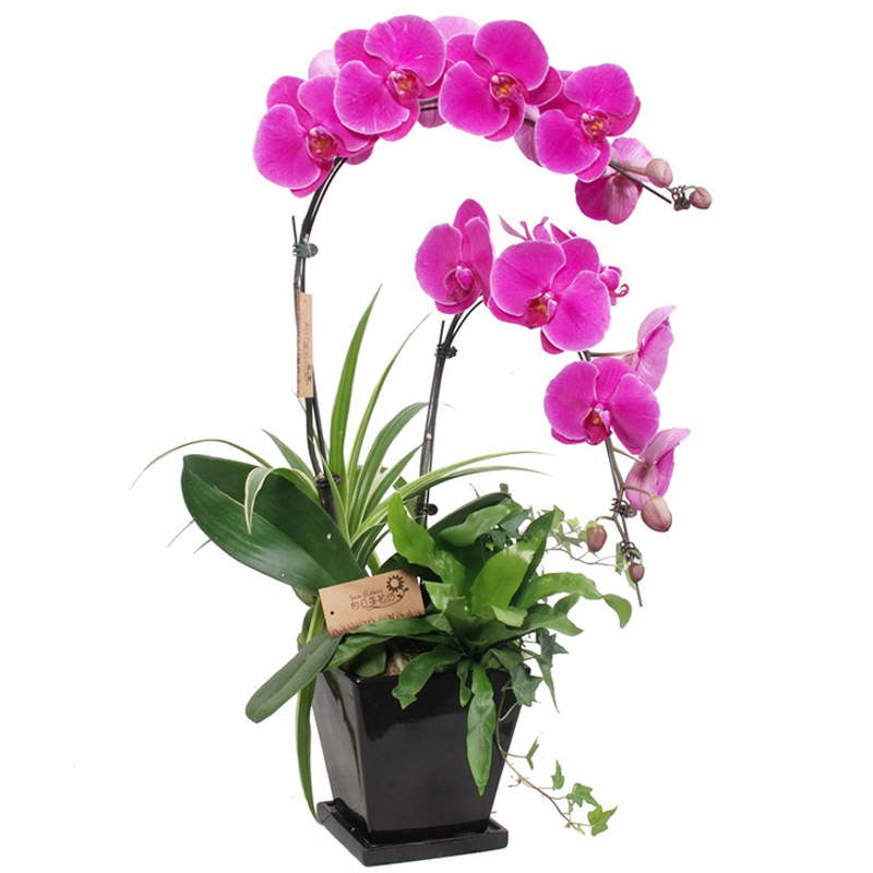 包 装:双株紫色蝴蝶兰,精美瓷盆装。