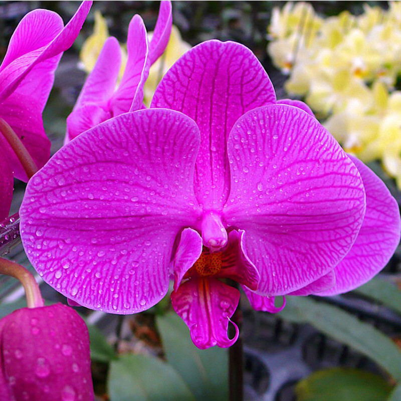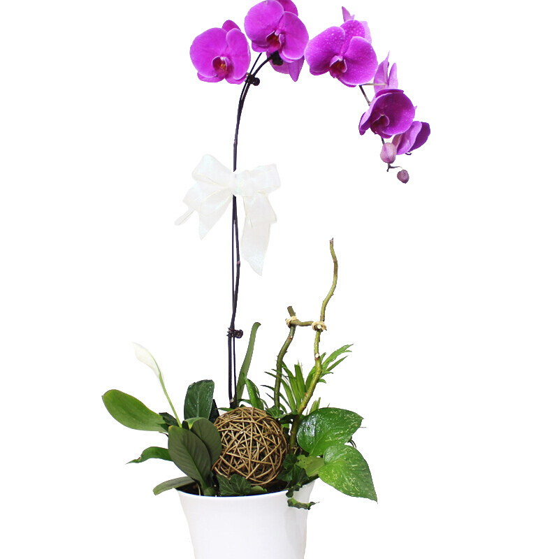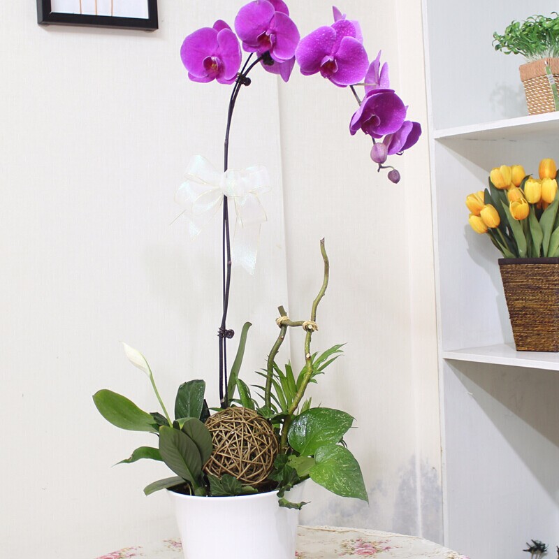 包 装:单株紫色蝴蝶兰盆栽,搭配精美瓷盆。