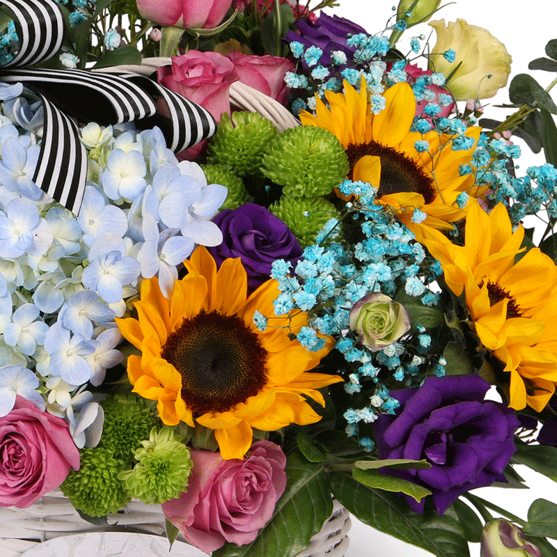 花 材:9支精品紫玫瑰、1支蓝色绣球、3支向日葵、4支多头紫色洋桔梗、2支香槟色洋桔梗,搭配蓝色满天星、绿色小雏菊、尤加利叶,一朵蝴蝶结装饰花面。