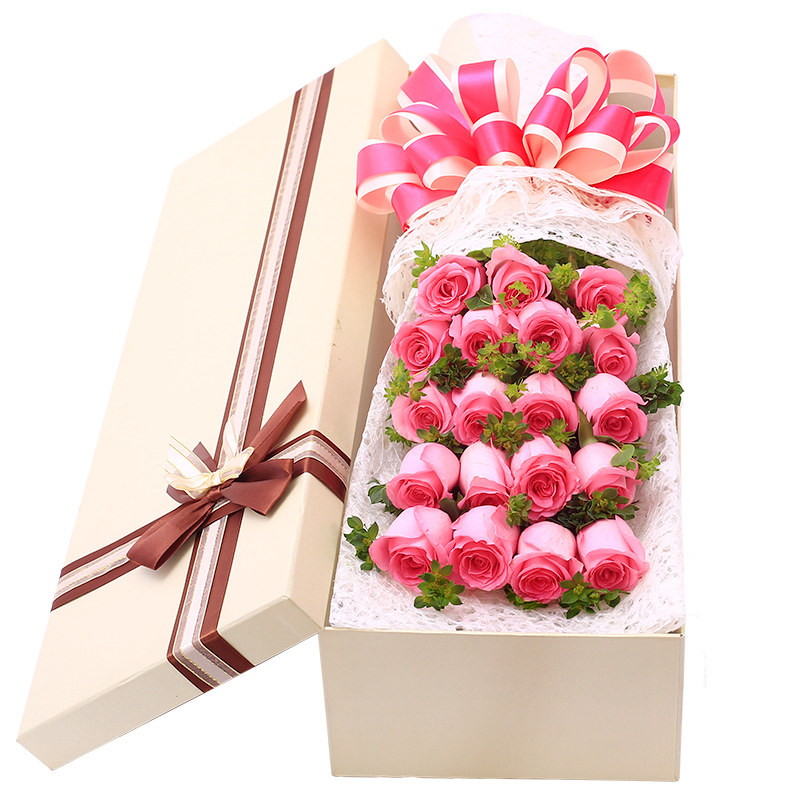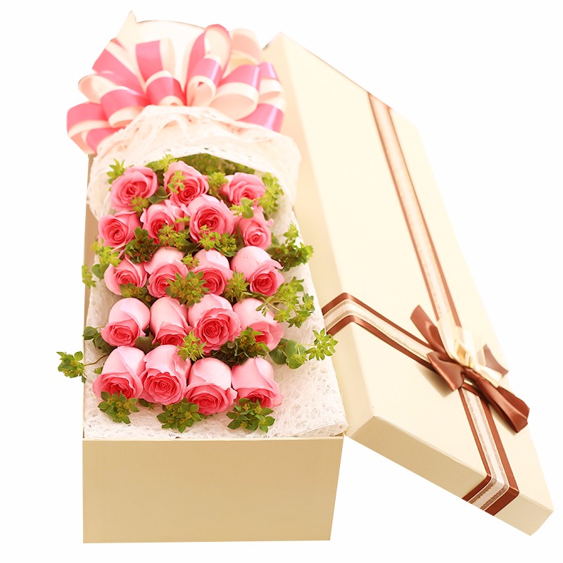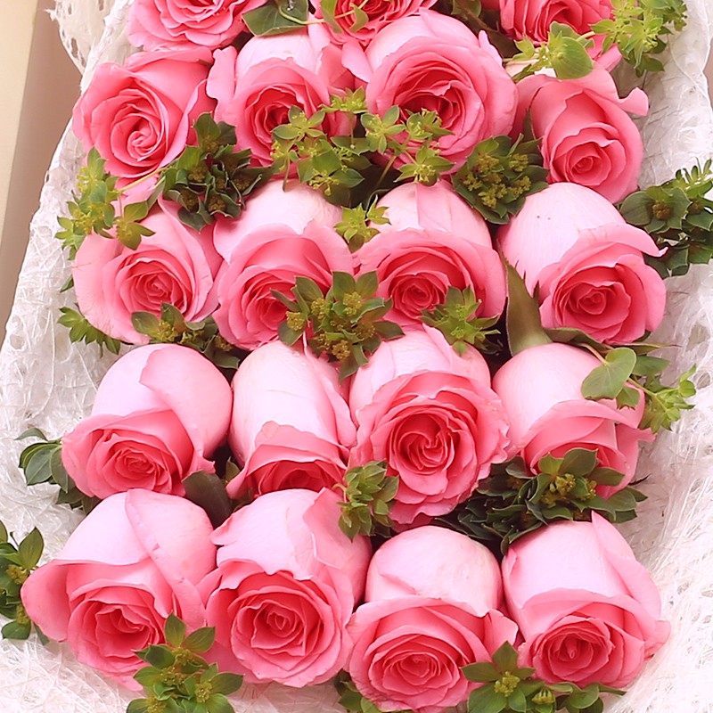 花材: 19支粉玫瑰,搭配适量叶上黄金间插。