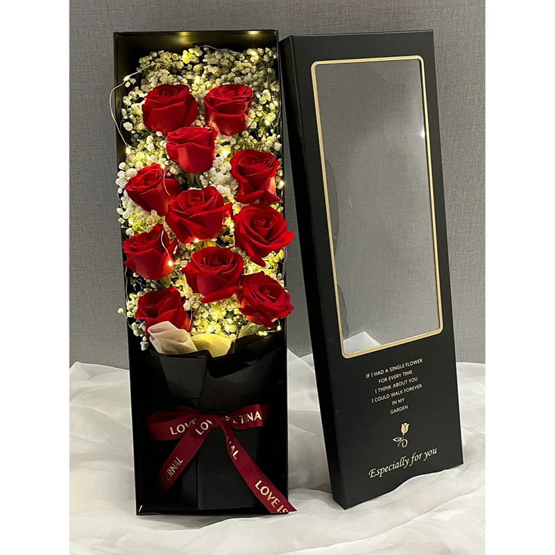 花材: 11朵红玫瑰,1条灯带,搭配满天星丰满包扎。
