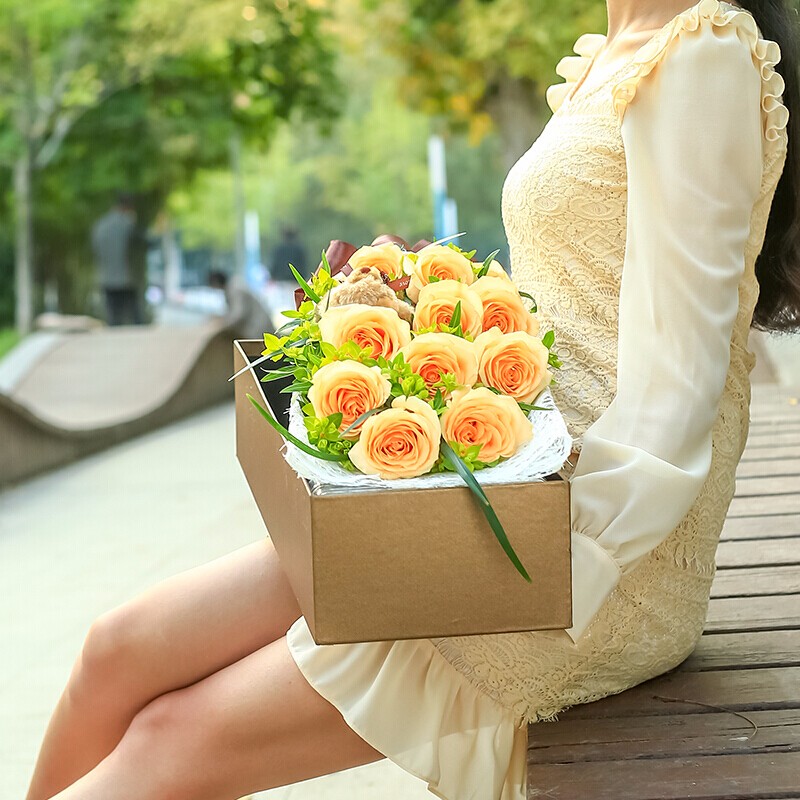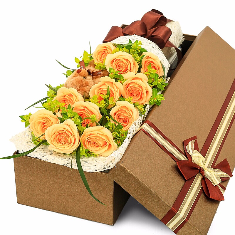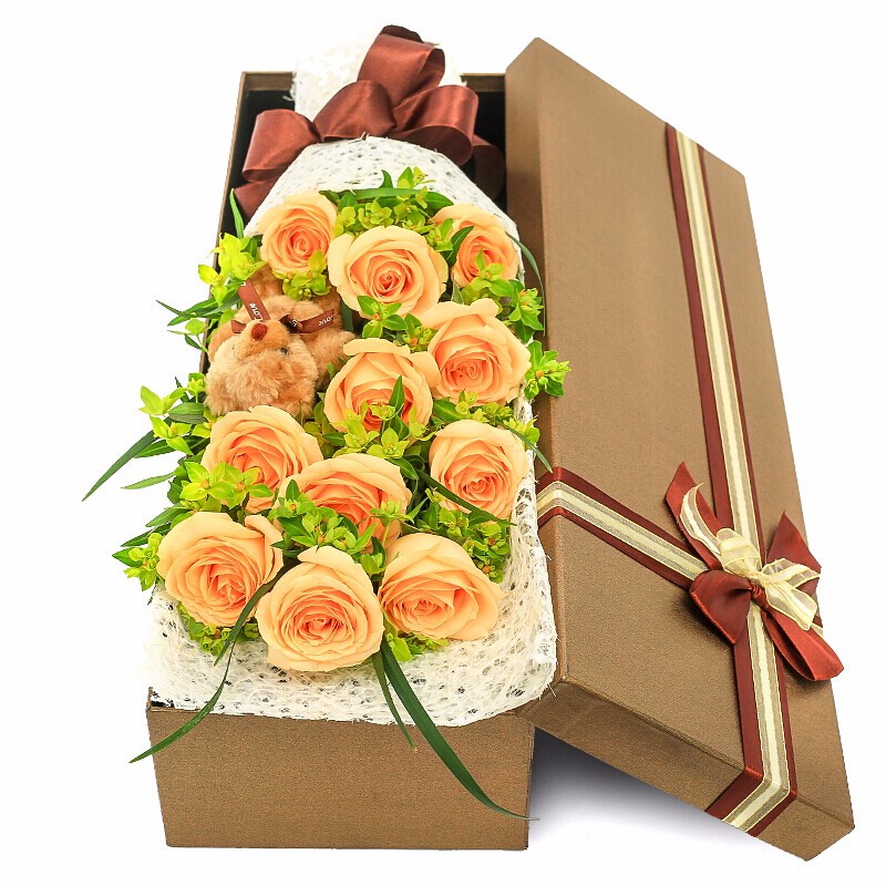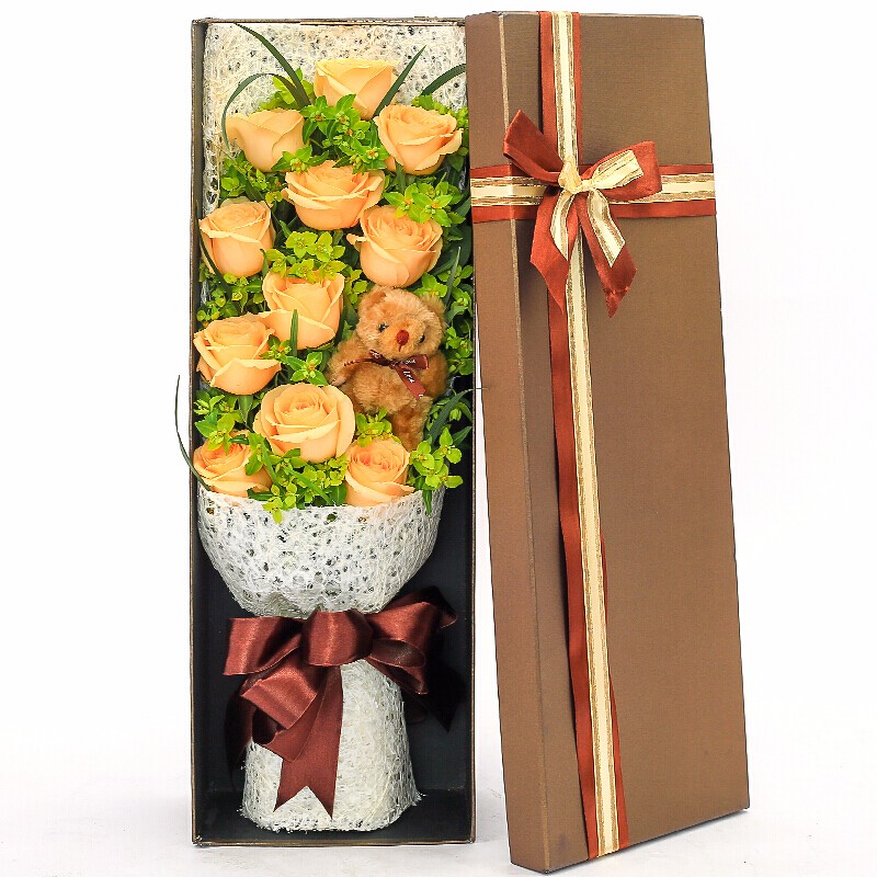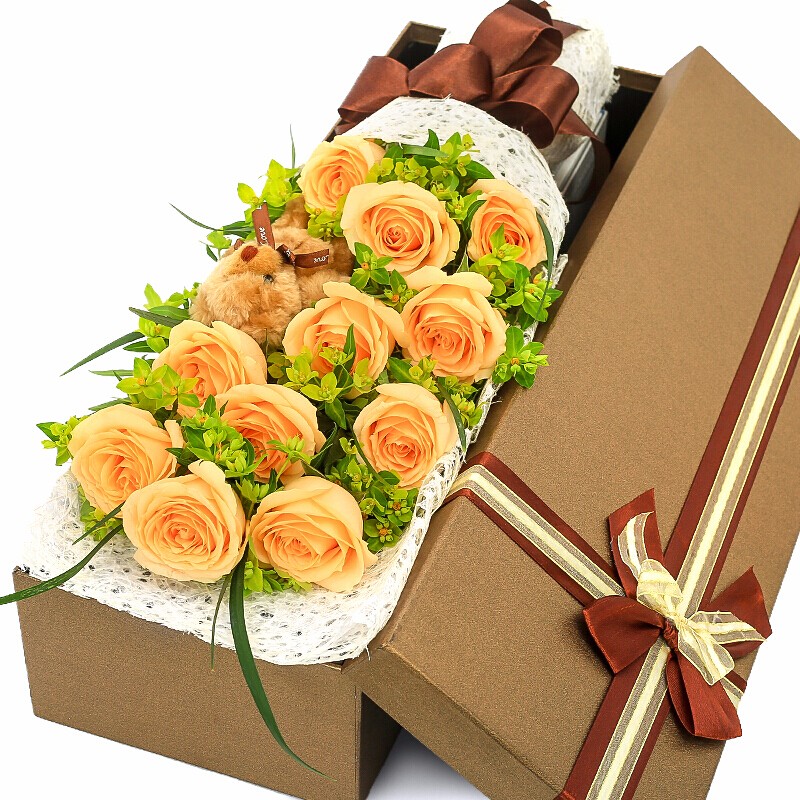 花 材:11支顶级香槟玫瑰,1只小熊,搭配叶上金点缀。