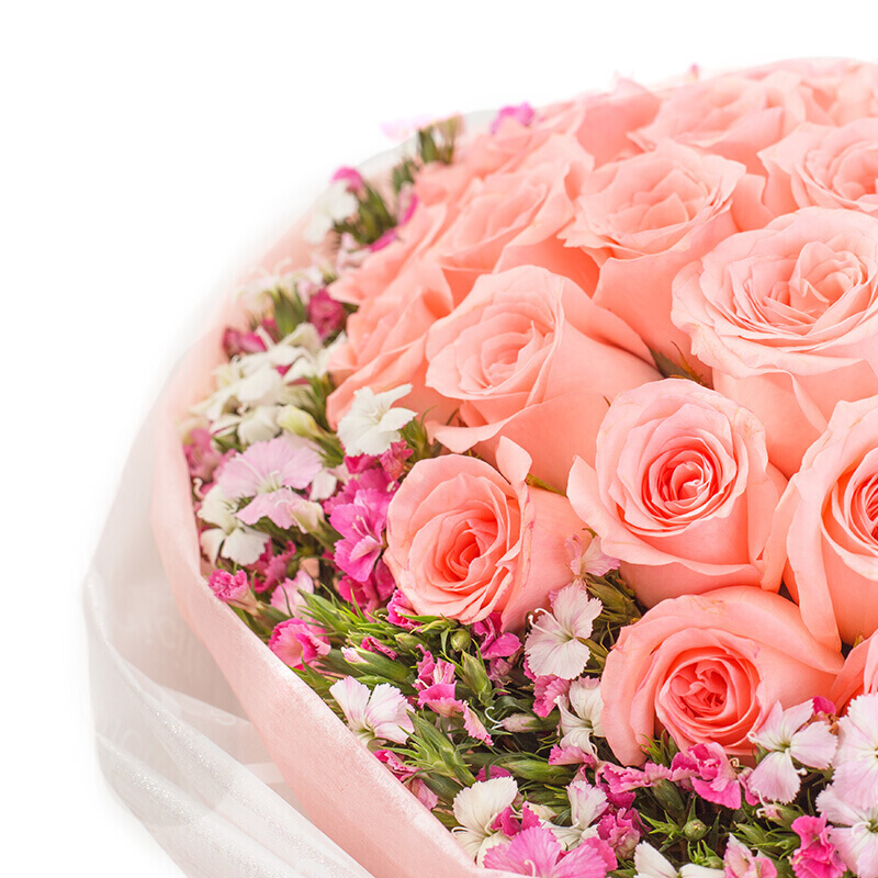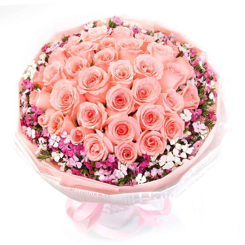 包 装:内层粉色雾面纸,外层白色雾面纸包成圆形花束,搭配粉色缎带扎蝴蝶结。