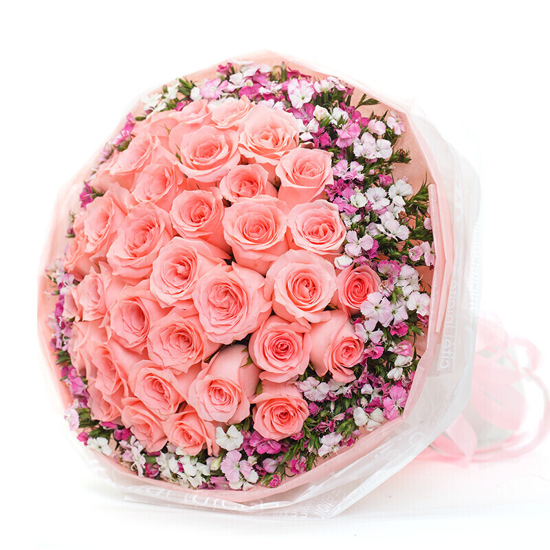 花材: 33朵精品戴安娜粉玫瑰,石竹梅环绕点缀。