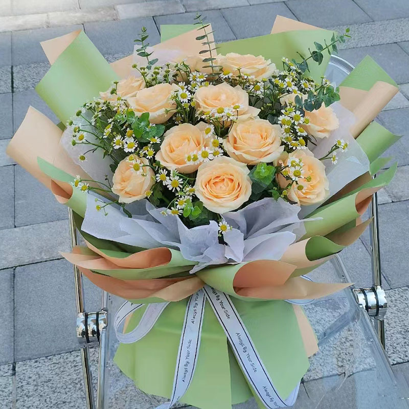花 材:11朵香槟玫瑰,搭配尤加利叶、洋甘菊(断货则用满天星代替)间插。