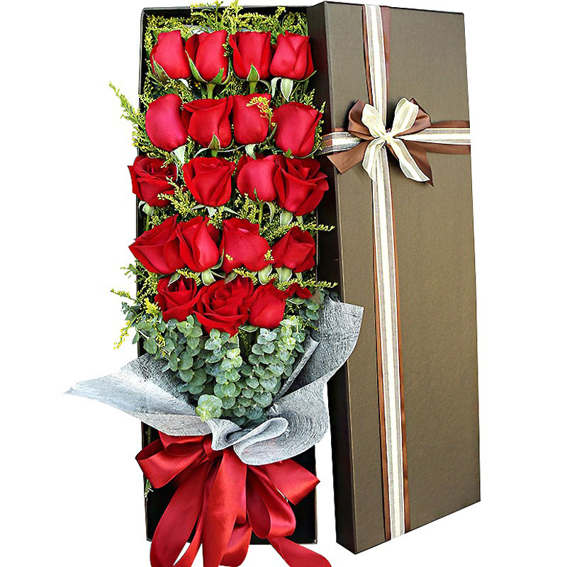花材: 19支精品红玫瑰,搭配适量黄莺、尤加利。