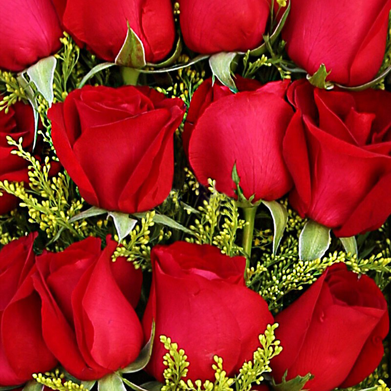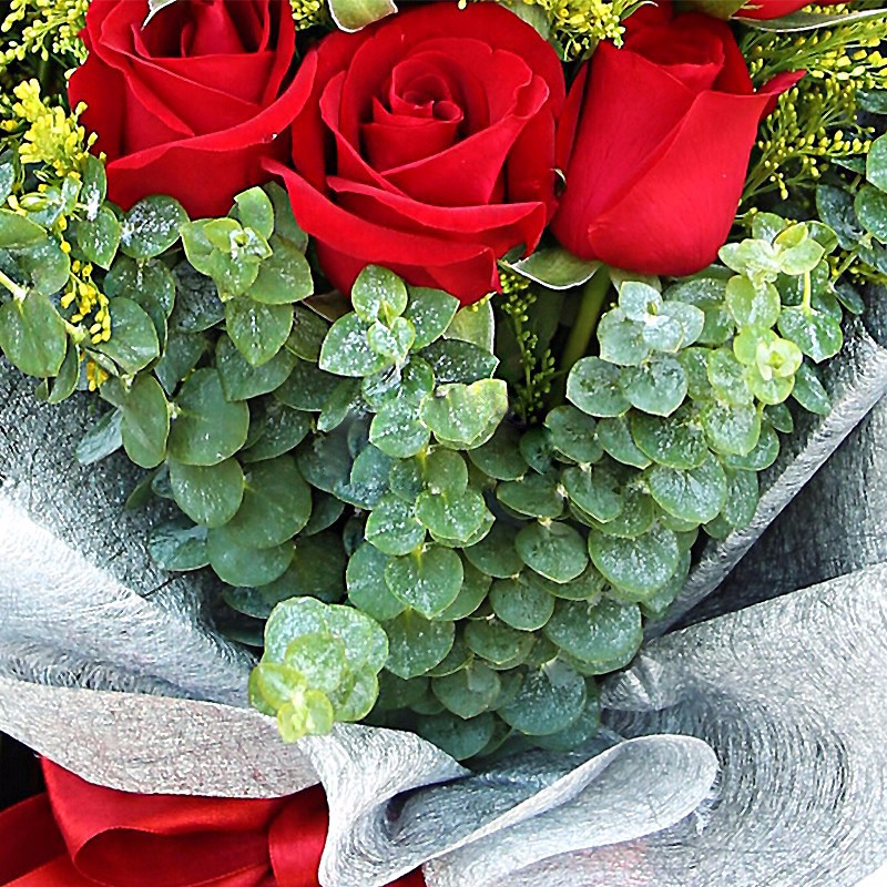 花 材:19支精品红玫瑰,搭配适量黄莺、尤加利。