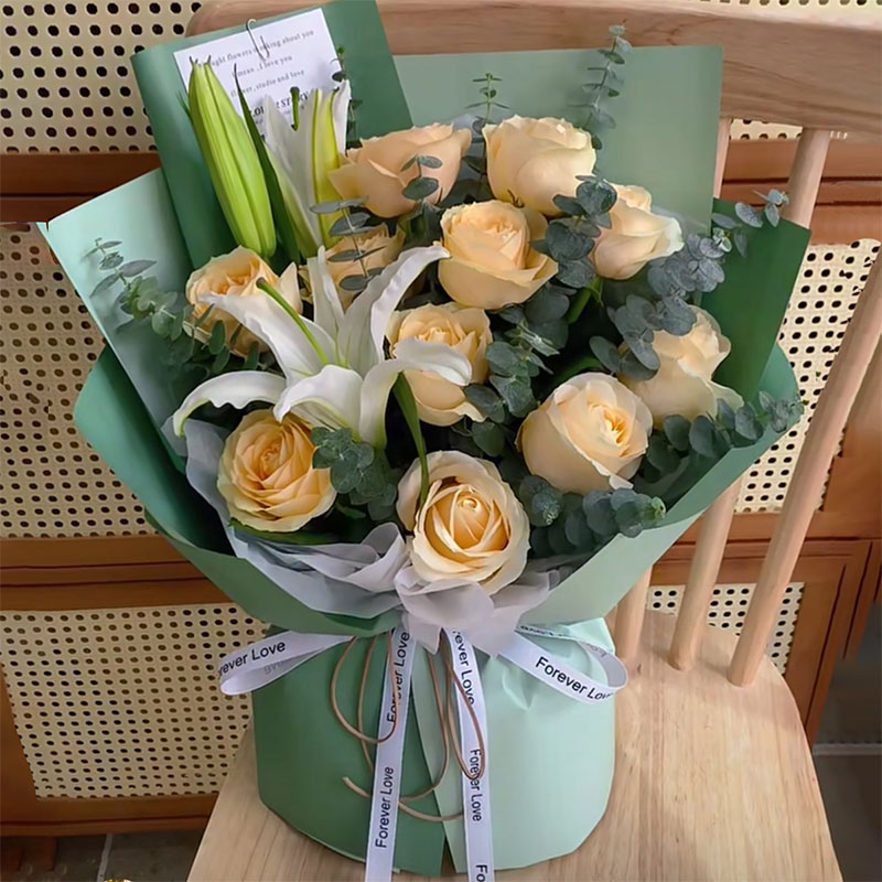花 材:11朵香槟玫瑰,1支白色多头香水百合,搭配尤加利叶间插。