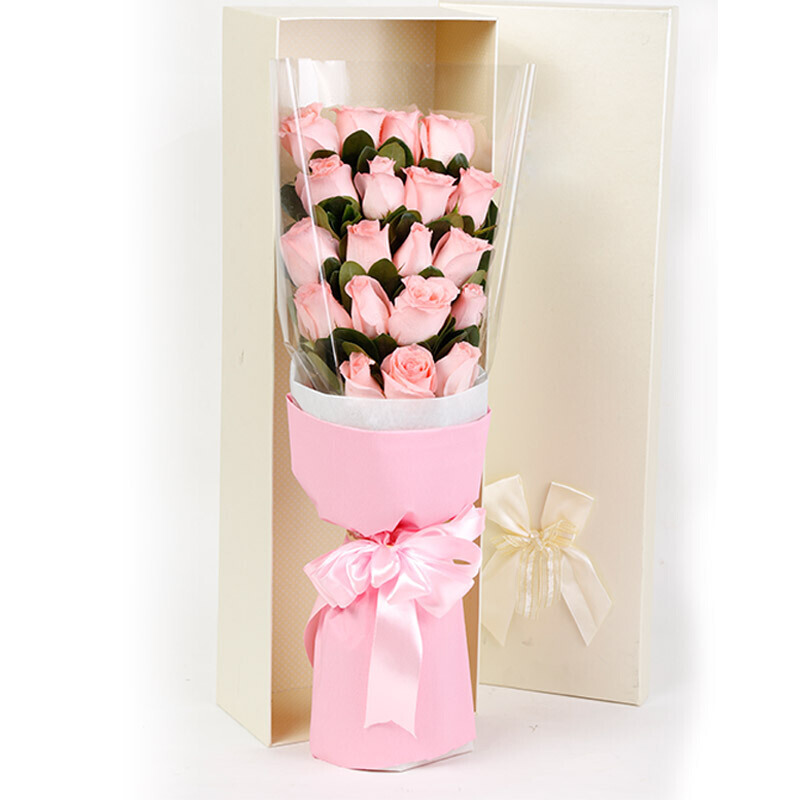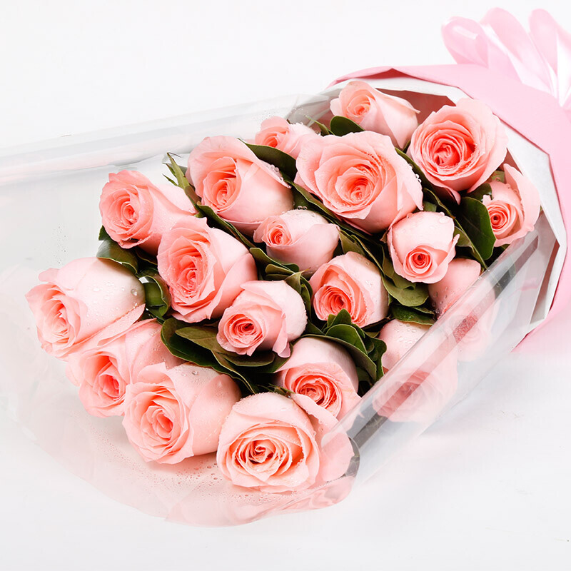 包 装:背部透明玻璃纸,正面内衬白色牛油纸,外搭粉色古典纸,手握处衬浅粉色法式蝴蝶结。