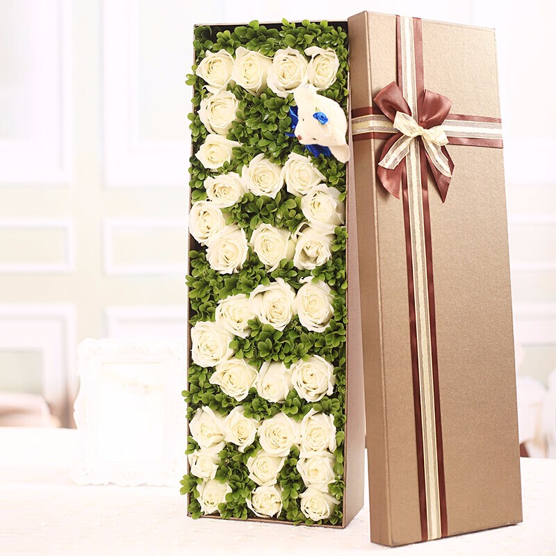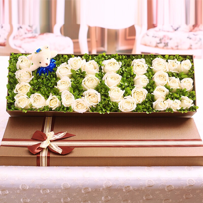 花材: 33朵精品白玫瑰,排列“LOVE”字形,1只小熊,绿叶点缀。