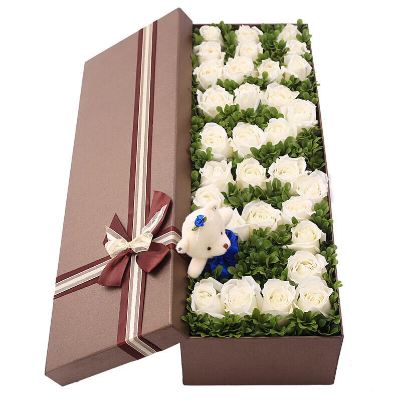 花 材:33朵精品白玫瑰,排列“LOVE”字形,1只小熊,绿叶点缀。