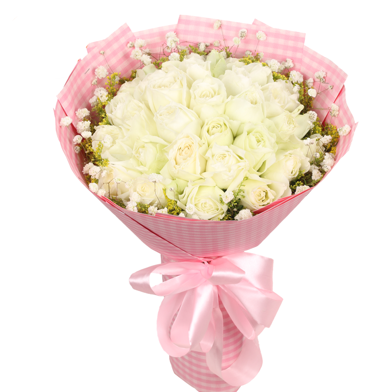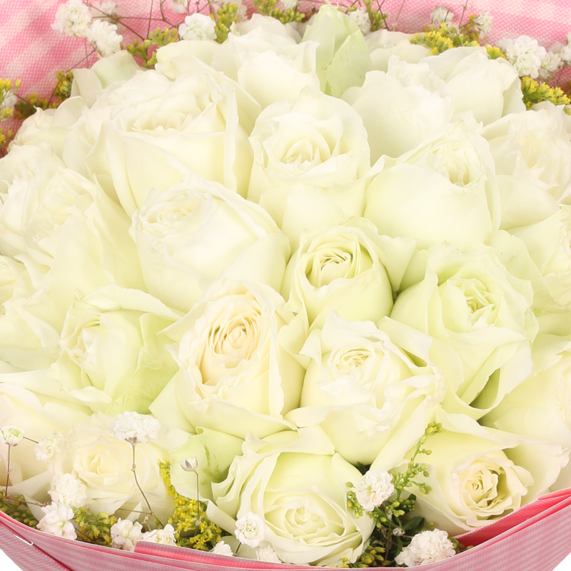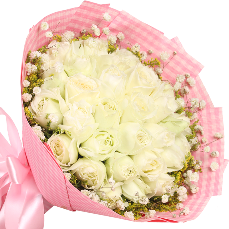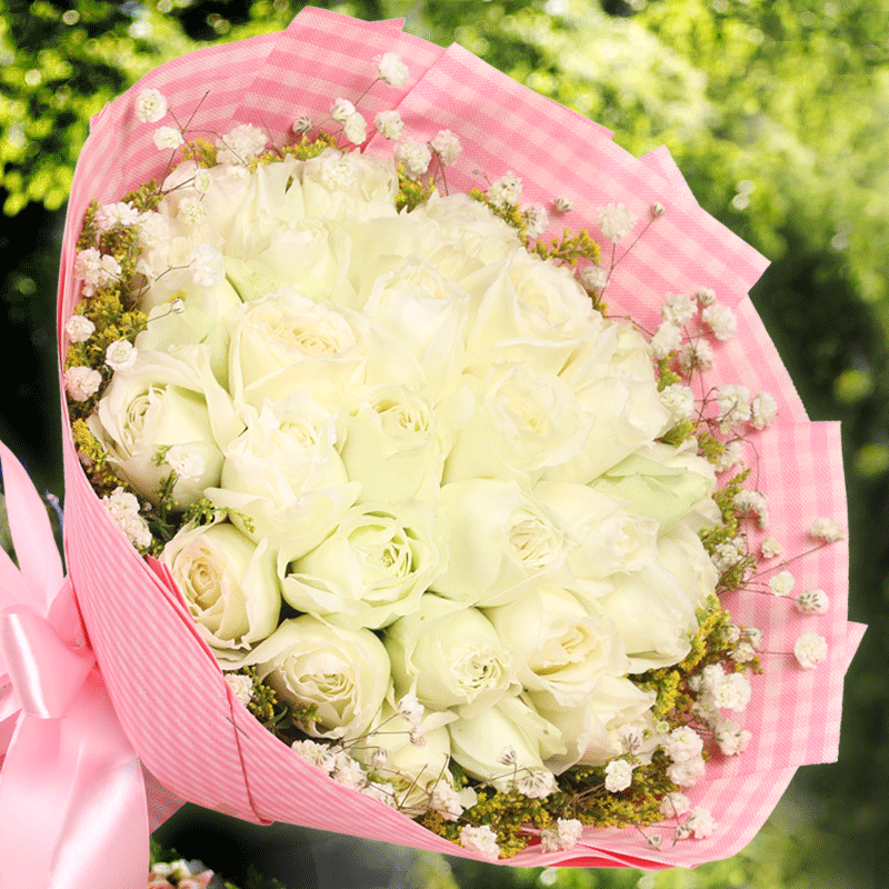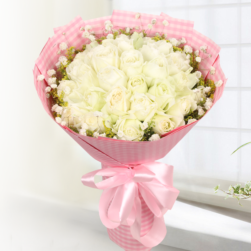 花 材:精选33朵白玫瑰,搭配满天星、黄莺草点缀。