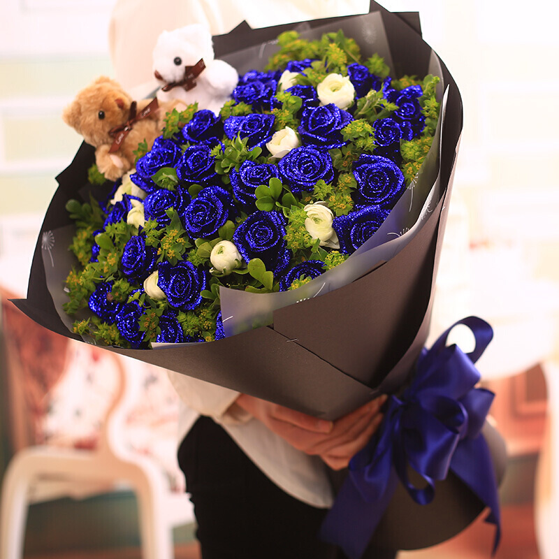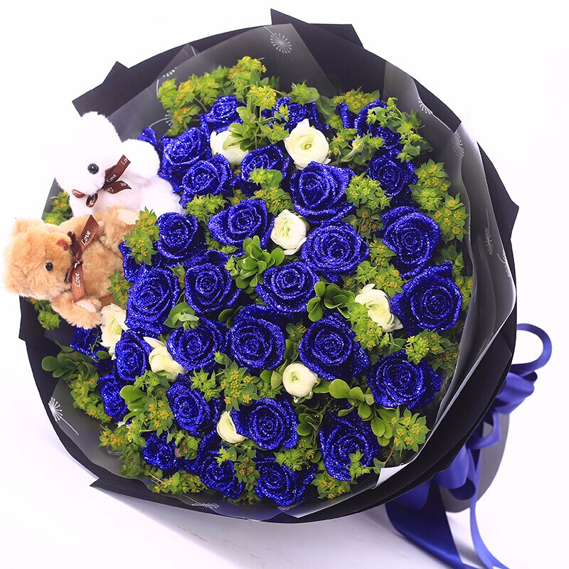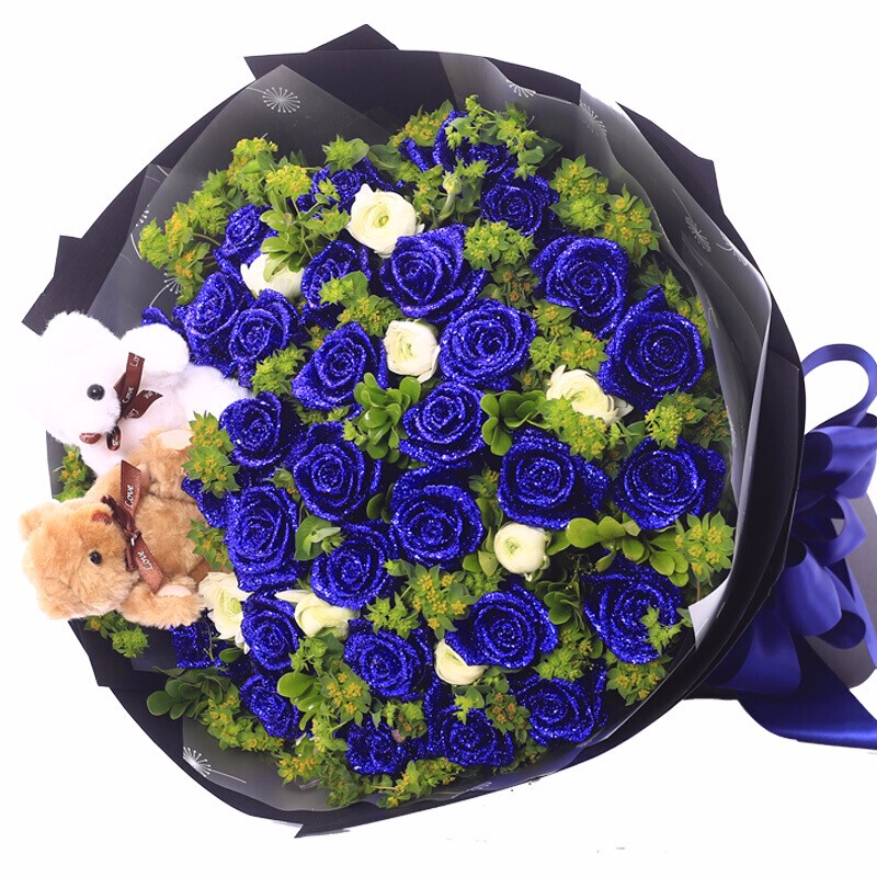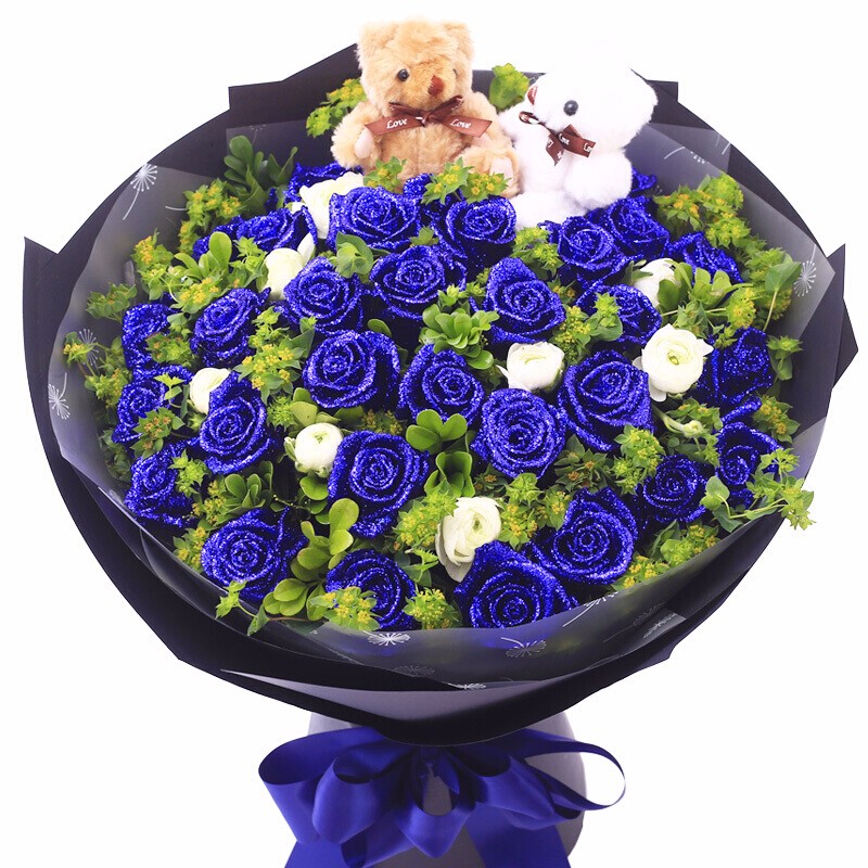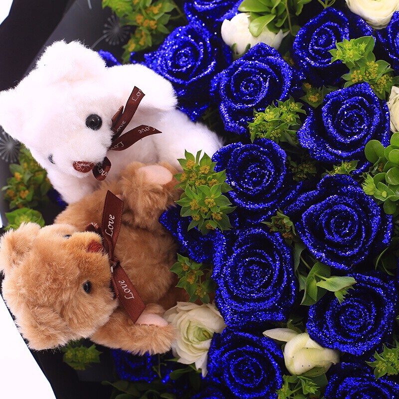 花 材:33支精品蓝色妖姬、2只可爱小熊,搭配适量白色洋桔梗、叶上黄金、绿叶间插。