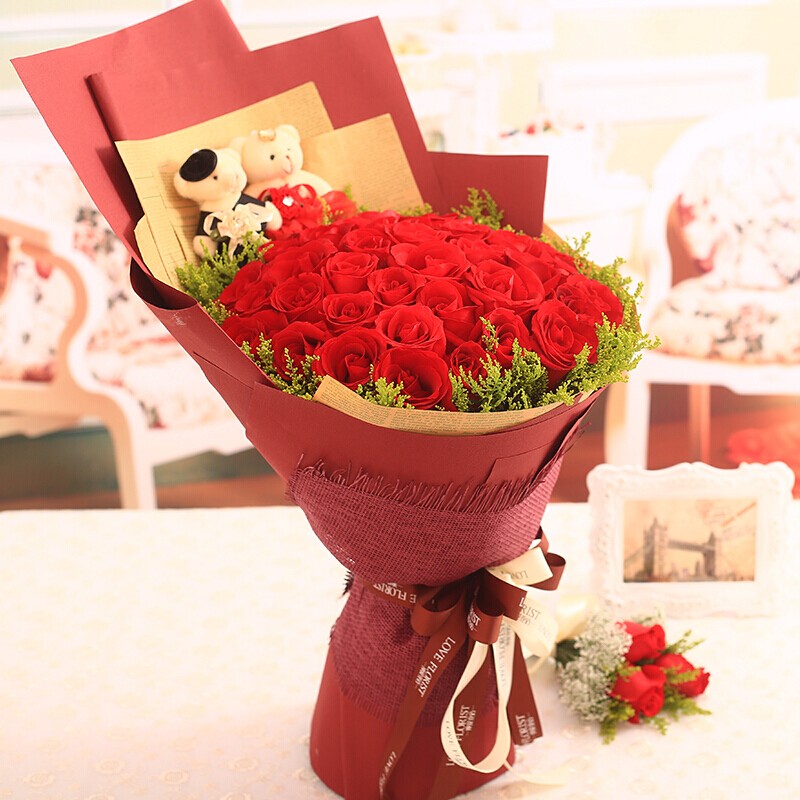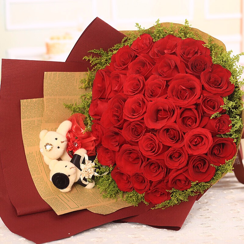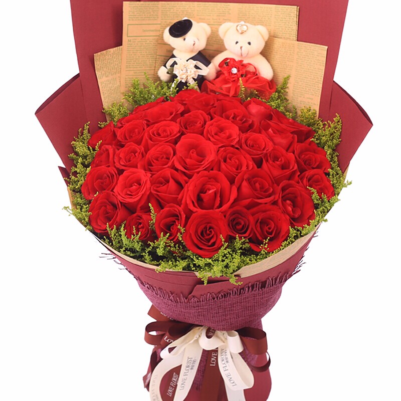 花材: 33支精品红玫瑰,2只可爱小熊,搭配黄莺外围点缀。