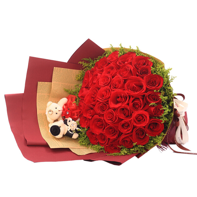 花 材:33支精品红玫瑰,2只可爱小熊,搭配黄莺外围点缀。