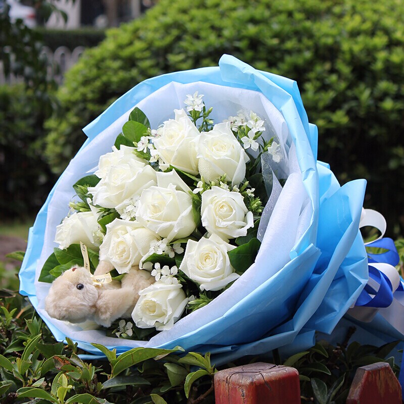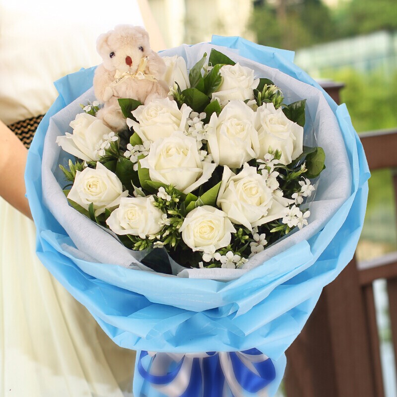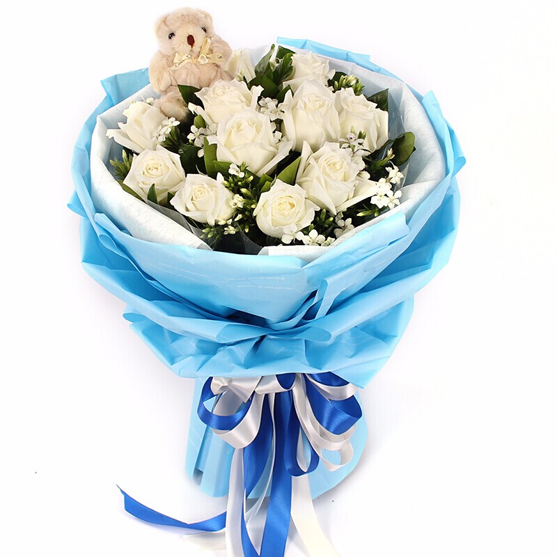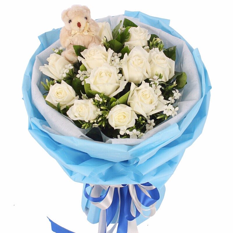 花材: 11朵精品白玫瑰,1只可爱小熊,相思梅点缀。