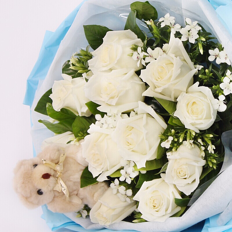 花 材:11朵精品白玫瑰,1只可爱小熊,相思梅点缀。