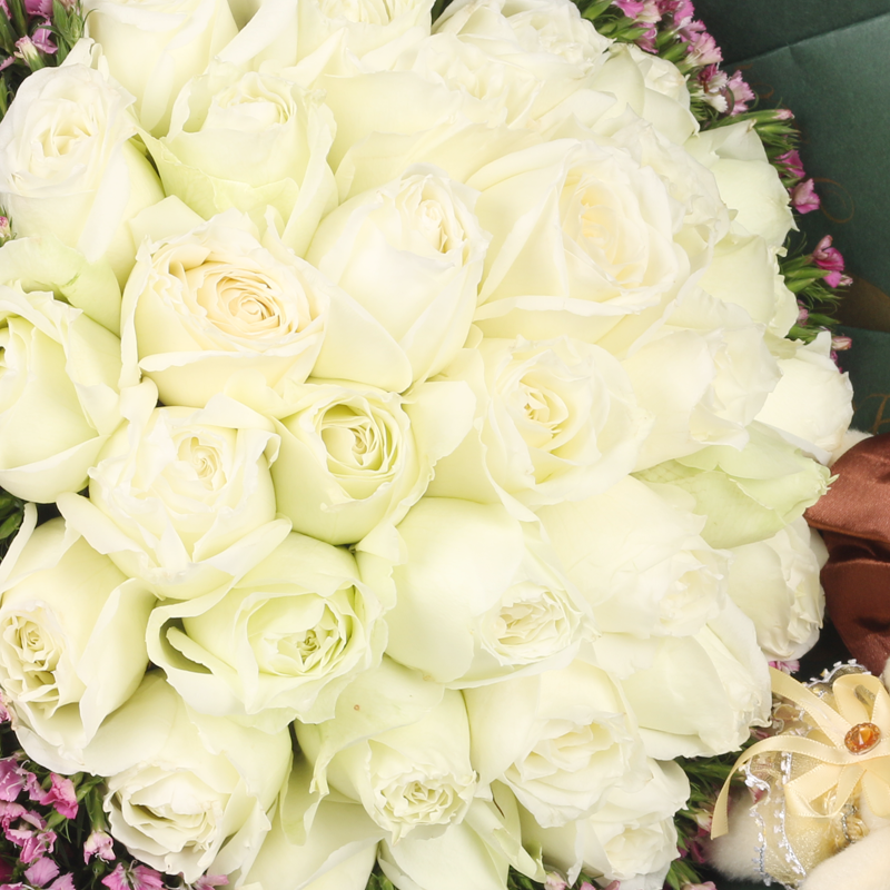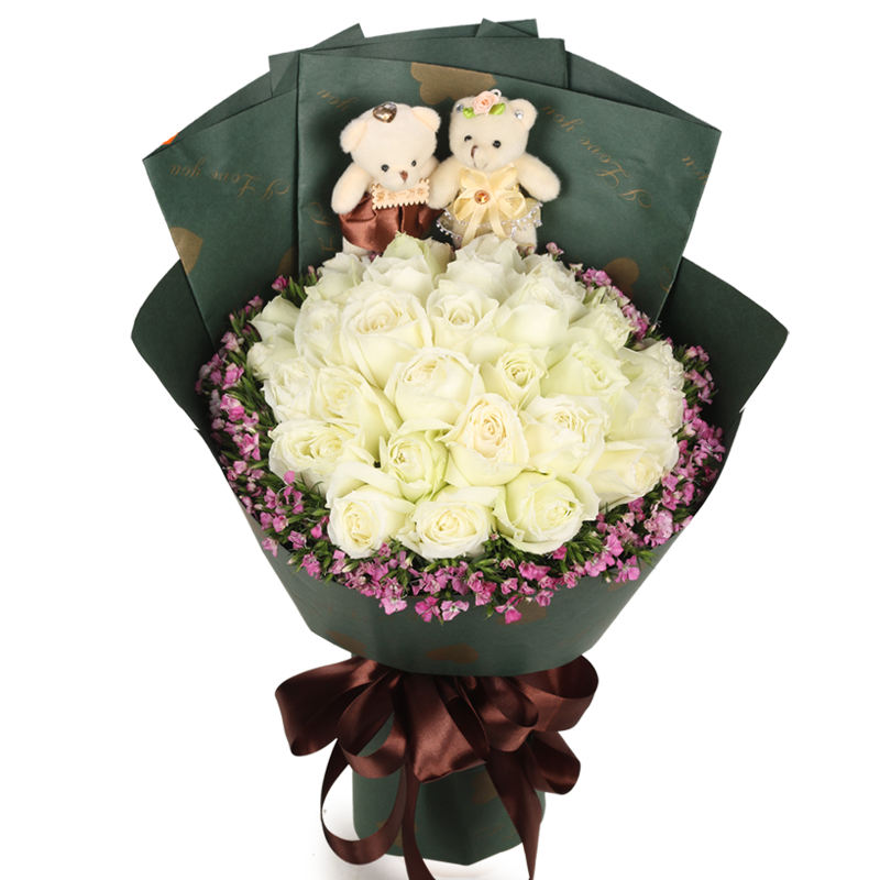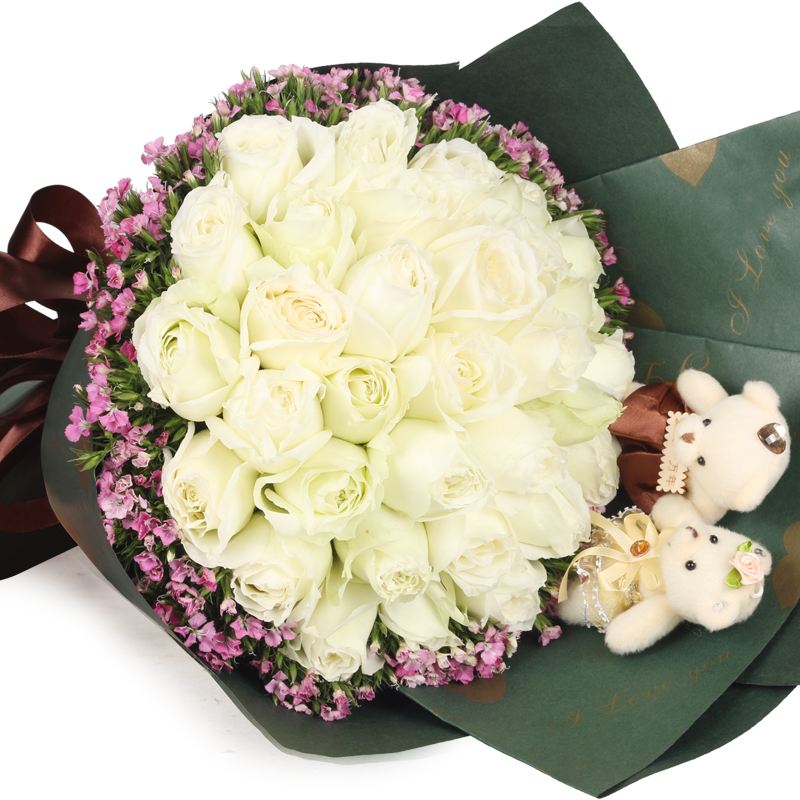 花材: 精选33朵白玫瑰,2只可爱小熊,勿忘勿外围点缀。