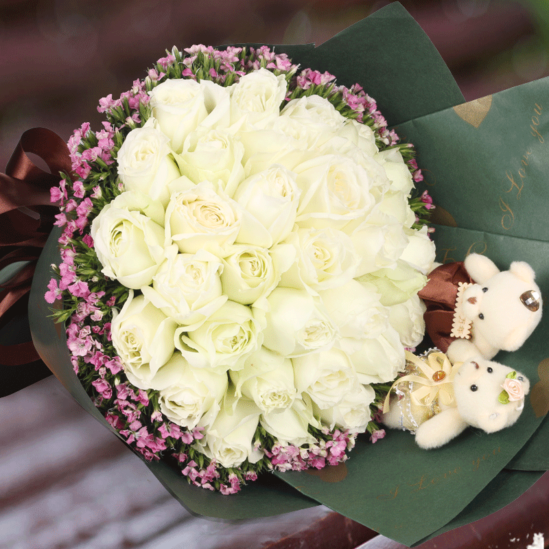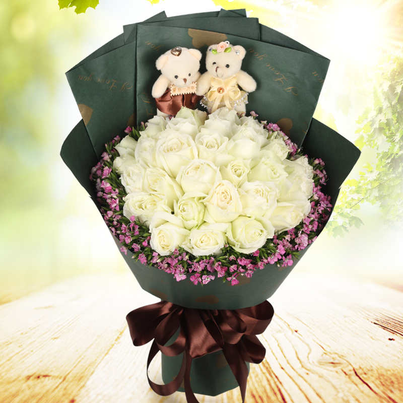 花 材:精选33朵白玫瑰,2只可爱小熊,勿忘勿外围点缀。