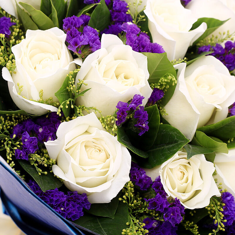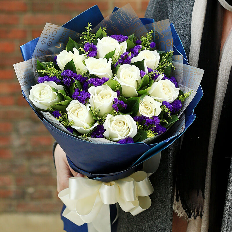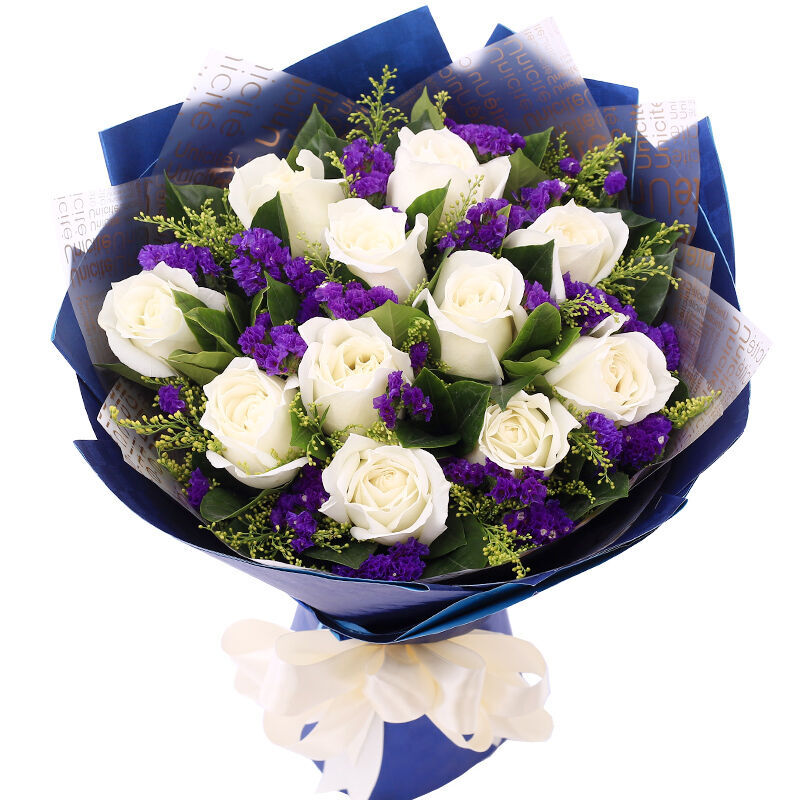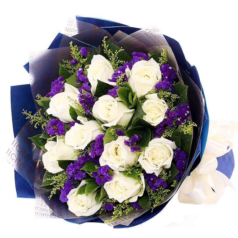 花 材:11支精品白玫瑰,搭配适量紫色勿忘我、黄莺、栀子叶间插